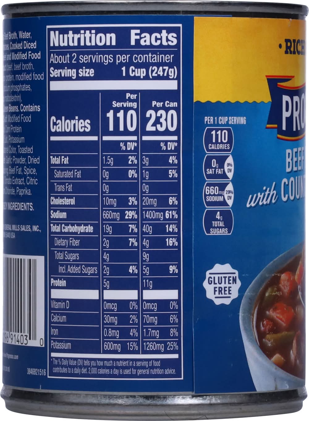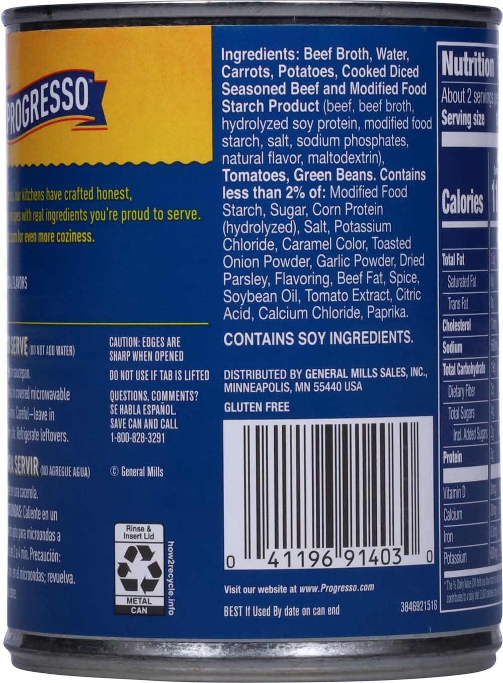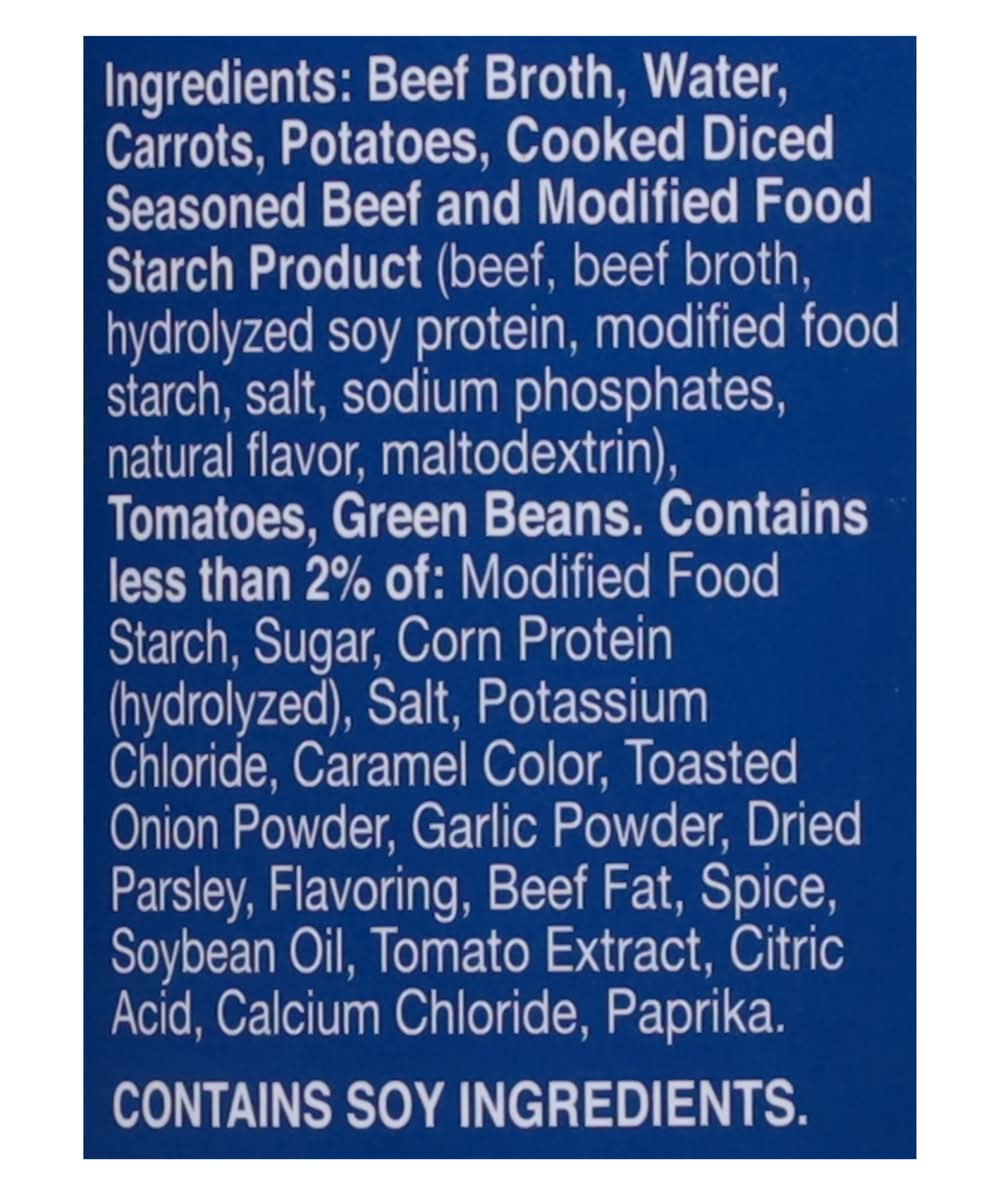 Ingredients: Beef Broth, Water, Carrots, Potatoes, Cooked Diced Seasoned Beef and Modified Food Starch Product (Beef, Beef Broth, Hydrolyzed Soy Protein, Modified Food Starch, Salt, Sodium Phosphates, Natural Flavor, Maltodextrin), Tomatoes, Green Beans, Contains Less than 2% of: Modified Food Starch, Sugar, Corn Protein (Hydrolyzed), Salt, Potassium Chloride, Caramel Color, Toasted Onion Powder, Garlic Powder, Dried Parsley, Flavoring, Beef Fat, Spice, Soybean Oil, Tomato Extract, Citric Acid, Calcium Chloride, Paprika Contains: soy