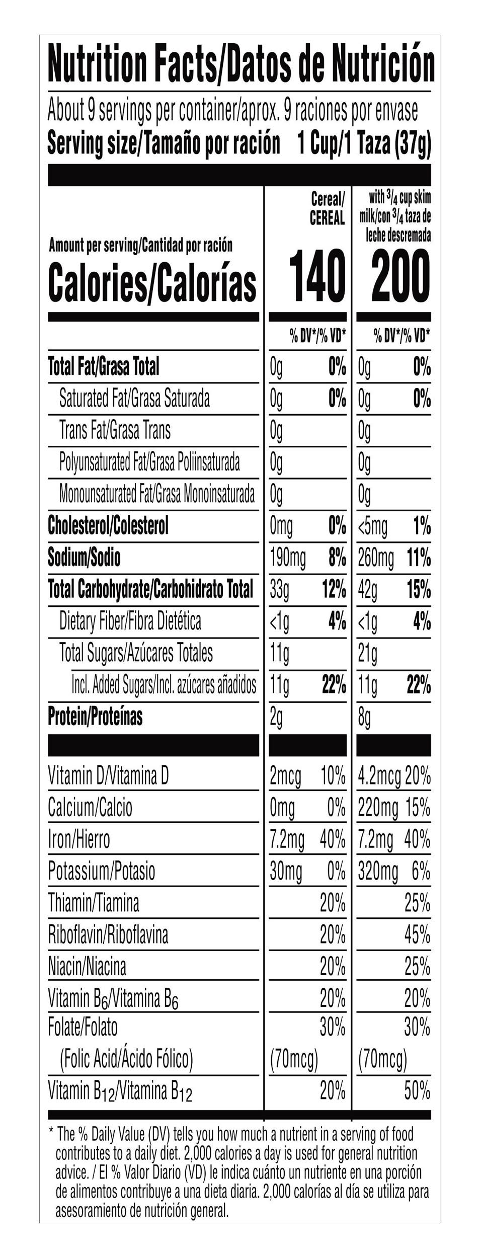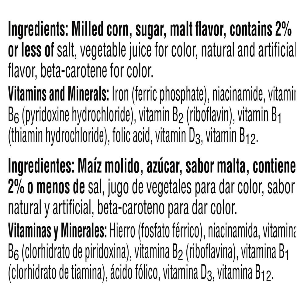 Ingredients: Milled Corn, Sugar, Malt Flavor, Contains 2% or Less of Salt, Vegetable Juice for Color, Natural and Artificial Flavor, Beta-Carotene for Color. Vitamins and Minerals: Iron (Ferric Phosphate), Niacinamide, Vitamin B6 (Pyridoxine Hydrochloride), Vitamin B2 (Riboflavin), Vitamin B1 (Thiamin Hydrochloride), Folic Acid, Vitamin D3, Vitamin B12 Contains: Corn
