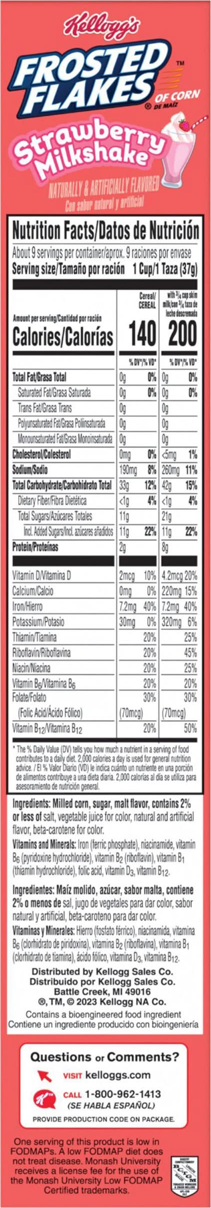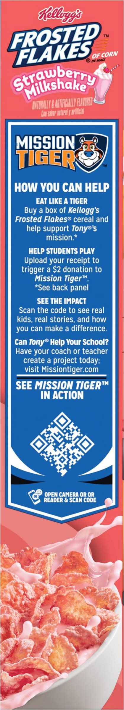 Just like Tony the Tiger, your whole family can get even their busiest days going with Kellogg's Frosted Flakes Strawberry Milkshake ready-to-eat breakfast cereal. These toasty, crunchy corn flakes are bursting with delicious strawberry flavor and create scrumptious strawberry flavored milk so adults and kids can experience a tasty and satisfying bowl every time. Each serving of this cereal is a good source of 8 vitamins and minerals; Enjoy a bowl of Kellogg's Frosted Flakes Strawberry Milkshake with your favorite dairy or nut milk. Eat pawfuls as a snack or late-night bite. Make it a sweet complement to your morning coffee or tea. Crush them up as a crunchy topping for ice cream. Kellogg's Frosted Flakes cereal gives you the sweet spark to go all in and let yourGR-R-REAT out. Flavor: Strawberry milkshake