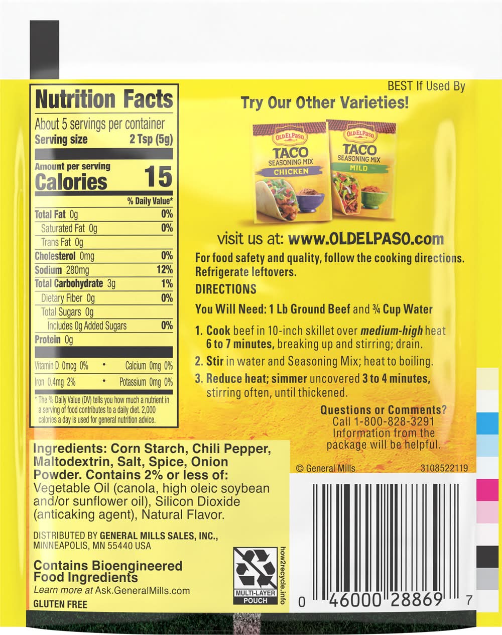 These Seasoning Mix packets are the perfect pantry staple that makes you and your family ready to celebrate taco night, every night. These great-tasting taco spices and seasonings help you get tacos on the table. Plus, you can use this seasoning to add a delicious kick to meats, soups, dips, nachos and more. For more than 80 years, Old El Paso has been bringing families and communities together to celebrate old and new traditions around delicious, Mexican-inspired flavors. We believe that any night can be a taco night, and we’re here to help make it a little easier and a lot more delicious. Our variety of crispy hard taco shells, tasty soft tortillas, flavorful seasonings, and much more help make taco night fun. • General Mills Sales, Inc., MinneapolisMN55440 • Packaging: Reusable