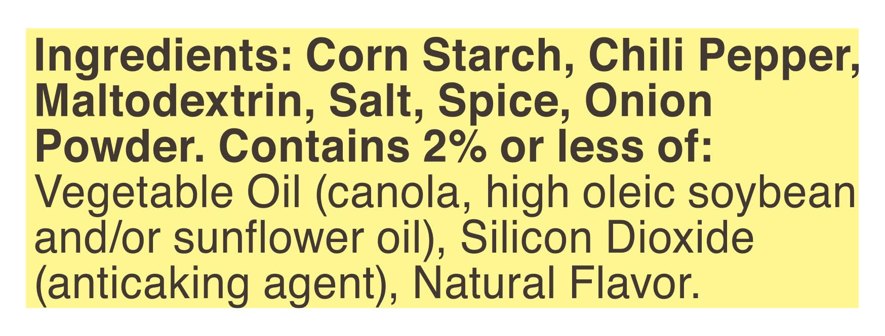 Ingredients: Chili Pepper, Maltodextrin, Salt, Spice, Onion Powder, Contains 2% or Less of: Vegetable Oil (Canola, High Oleic Soybean and/or Sunflower Oil), Silicon Dioxide (Anticaking Agent), Natural Flavor Contains: Corn, Soybeans