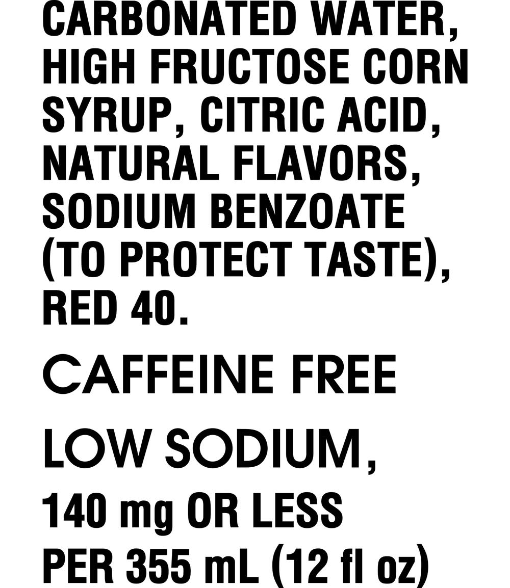 Ingredients: Carbonated Water, High Fructose Corn Syrup, Natural Flavors, Citric Acid, Sodium Benzoate (To Protect Taste), Red 40. Contains: Corn
