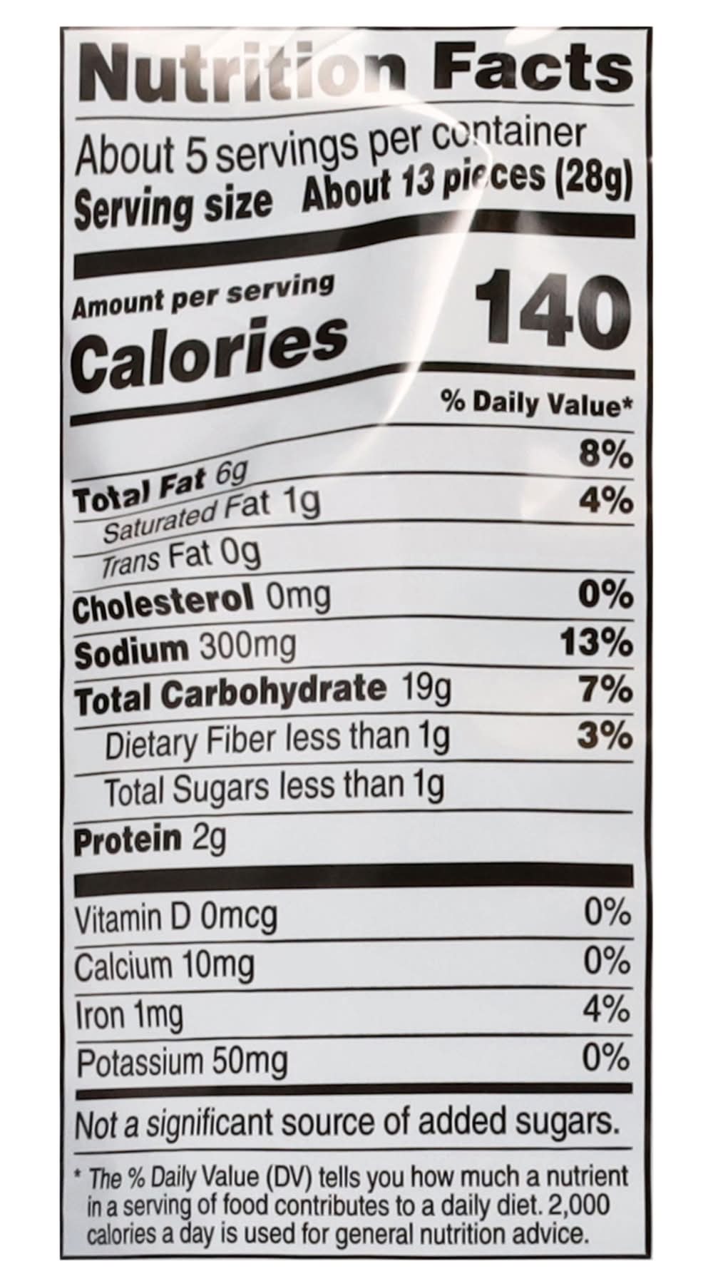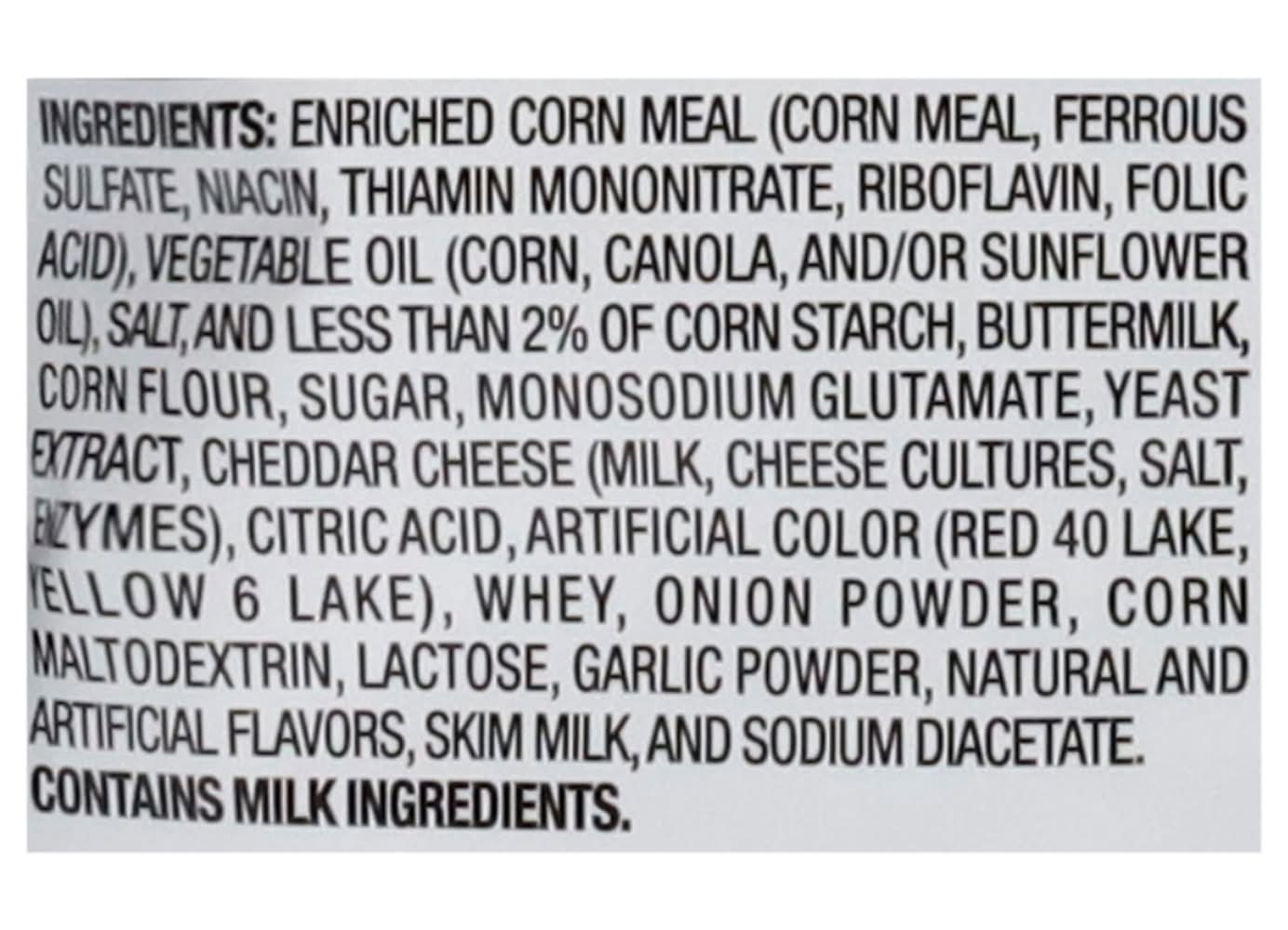 Ingredients: Enriched Corn Meal (Corn Meal, Ferrous Sulfate, Niacin, Thiamin Mononitrate, Riboflavin, Folic Acid), Vegetable Oil (Corn, Canola, and/or Sunflower Oil), Salt, and Less than 2% of Corn Starch, Buttermilk, Corn Flour, Sugar, Monosodium Glutamate, Yeast Extract, Cheddar Cheese (Milk, Cheese Cultures, Salt, Enzymes), Citric Acid, Artificial Color (Red 40 Lake, Yellow 6 Lake), Whey, Onion Powder, Corn Maltodextrin, Lactose, Garlic Powder, Natural and Artificial Flavors, Skim Milk, and Sodium Diacetate Contains: Milk, Lactose
