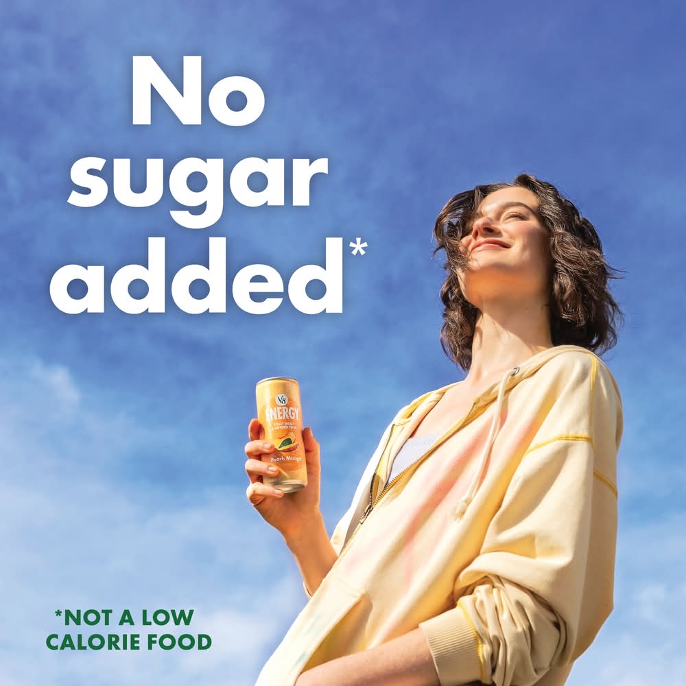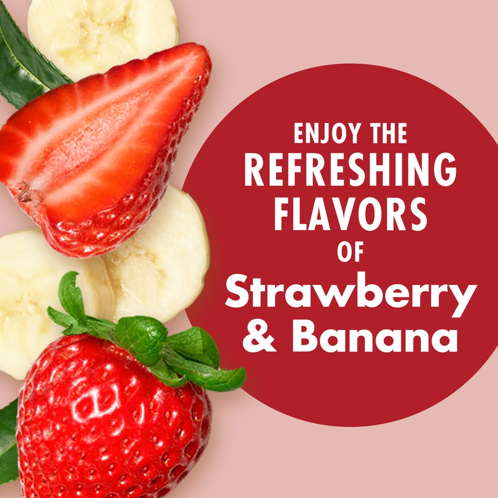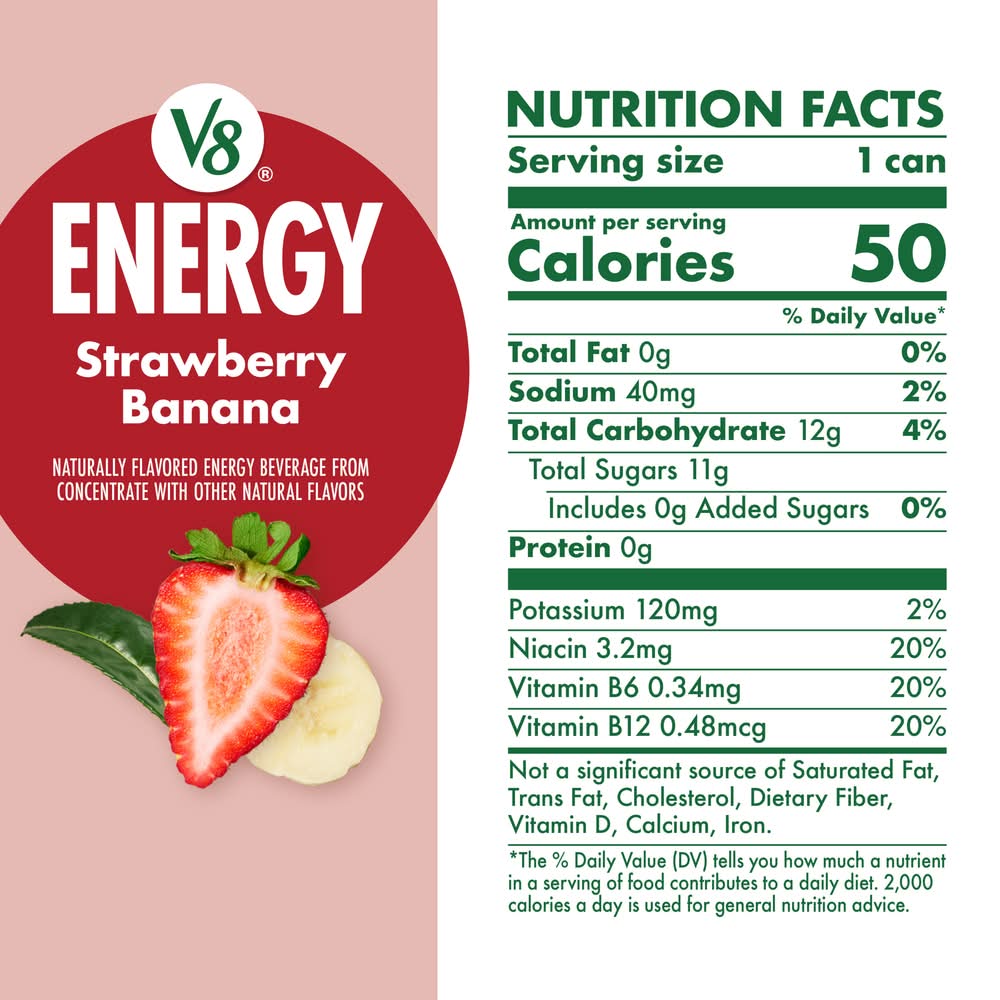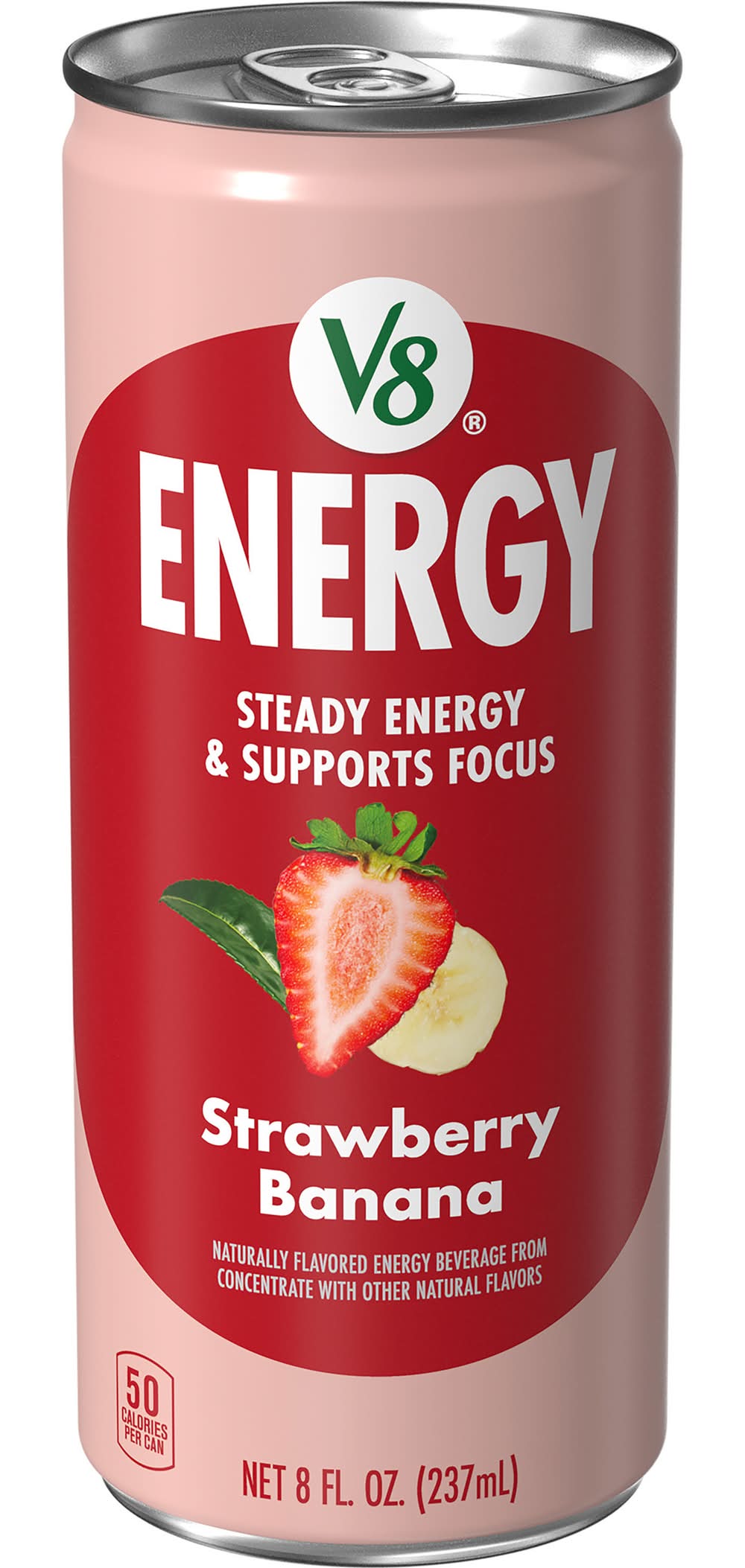 Take a moment to enjoy the refreshing taste of V8 Energy Strawberry Banana Energy Drink. Designed for those who savor the moment and aim to balance work, play, and everything in between, this energizing blend offers a refreshing way to support focus and keep you moving forward. With the delicious taste of strawberry banana and the benefits of a combined serving of fruits and veggies, it's a flavorful choice for those who enjoy living life tastefully. V8 Energy Strawberry Banana Energy Drink provides steady energy from black and green tea, delivering 80 mg of caffeine per can—comparable to a cup of coffee. It's a great option for those seeking a coffee substitute without sacrificing taste or energy. Plus, it's made with non-GMO ingredients, contains no artificial colors, and has no high fructose corn syrup. And with no added sugars*, this drink is as thoughtful as it is delicious. Whether you're tackling your to-do list or unwinding with a mocktail-inspired creation, V8 Energy is here to energize your moments. Refresh, recharge, and live tastefully. (*Not a low calorie food; see nutrition panel for sugar and calorie content.) Flavor: Strawberry -banana