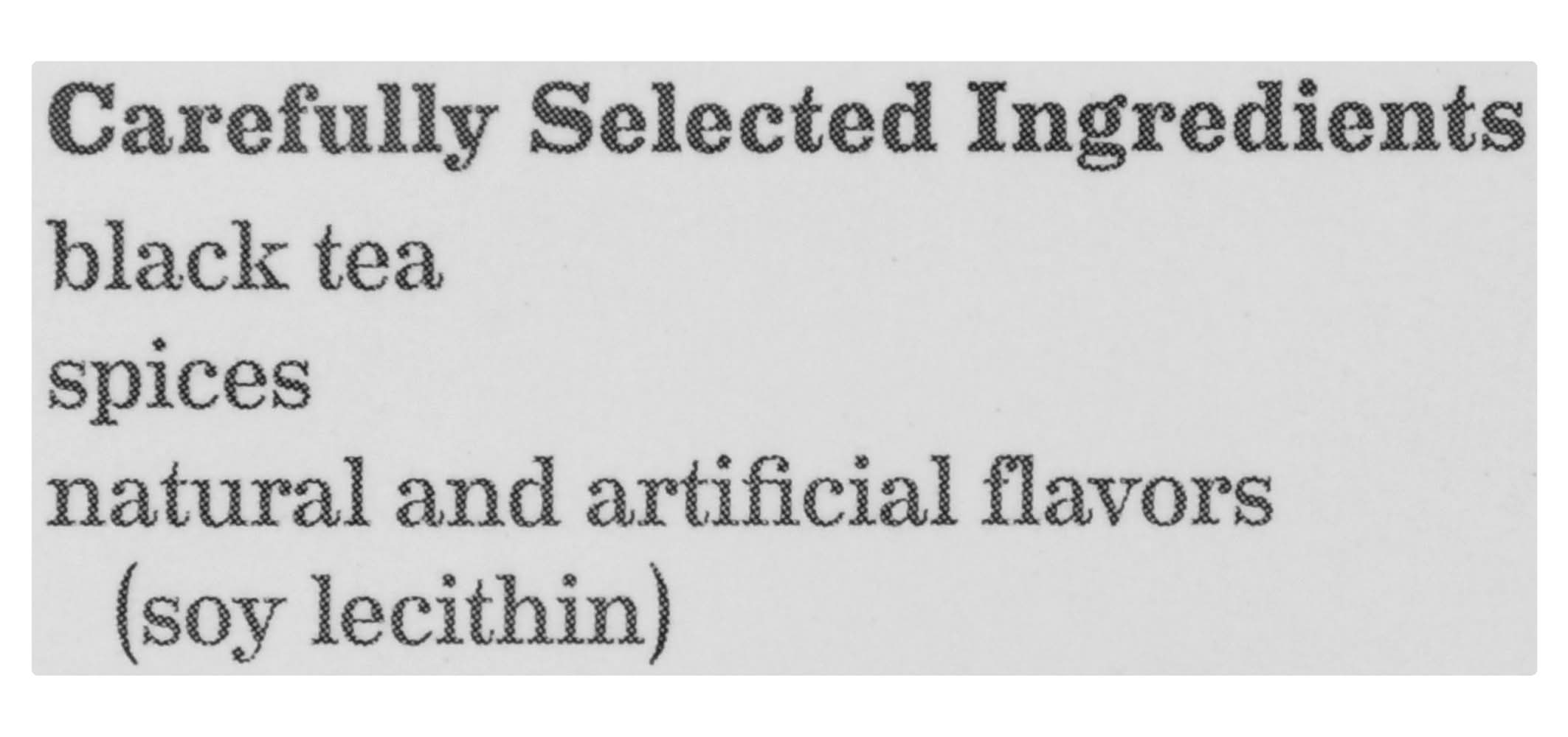 Ingredients: Carefully Selected Ingredients: Black Tea, Spices, Natural and Artificial Flavors (Soy Lecithin)