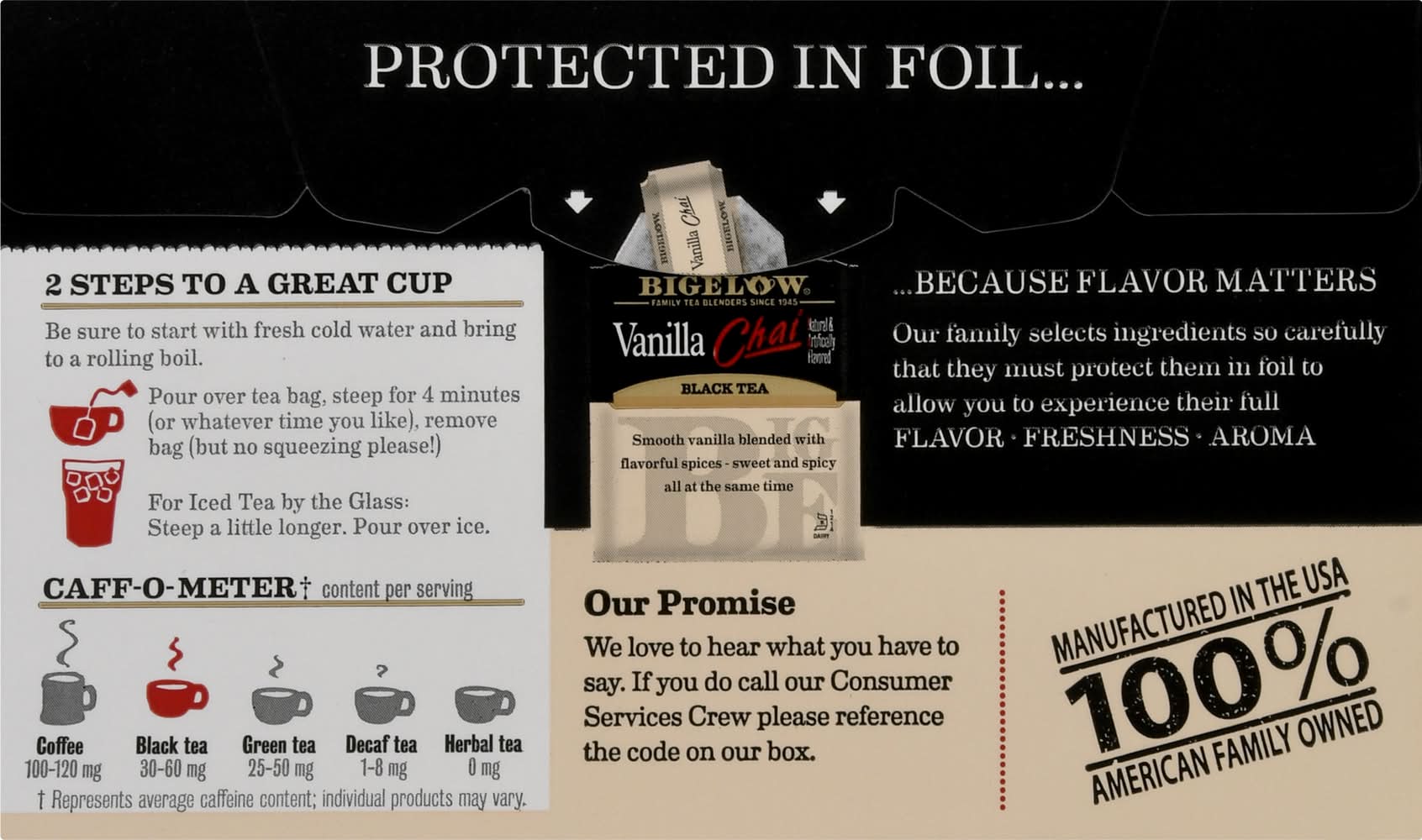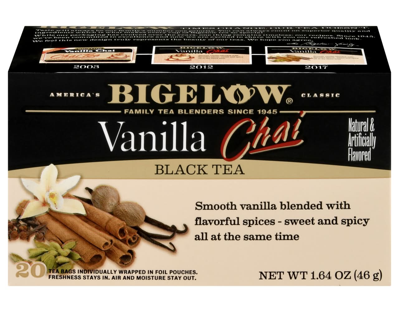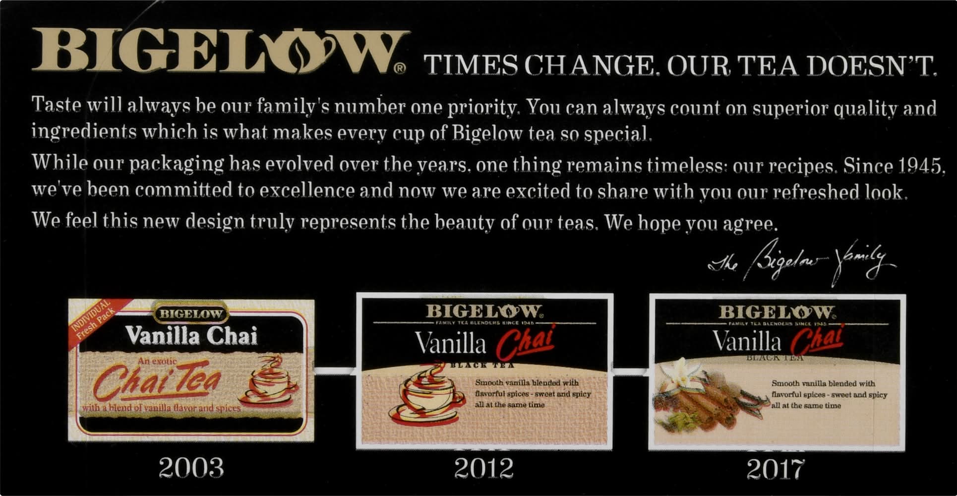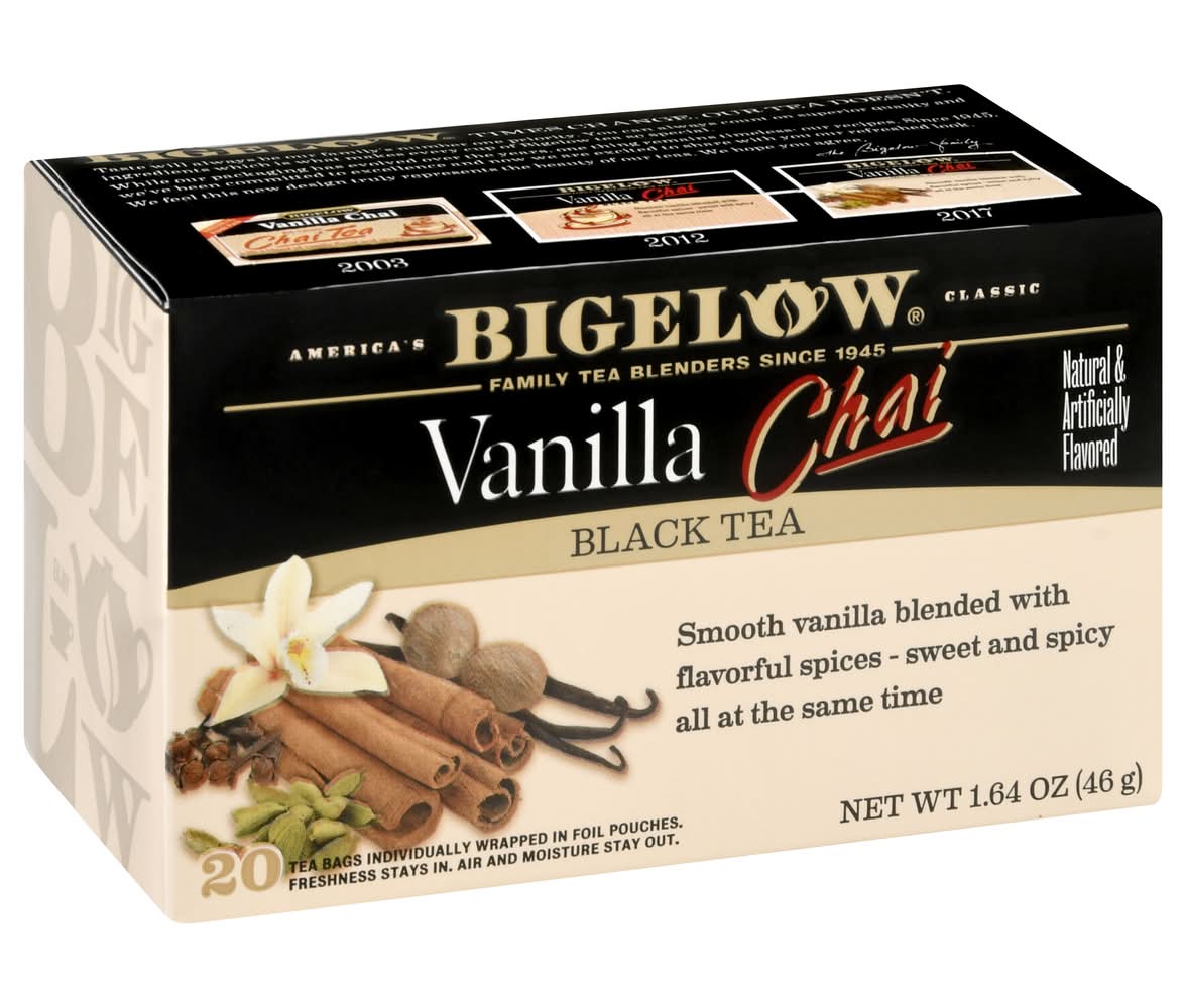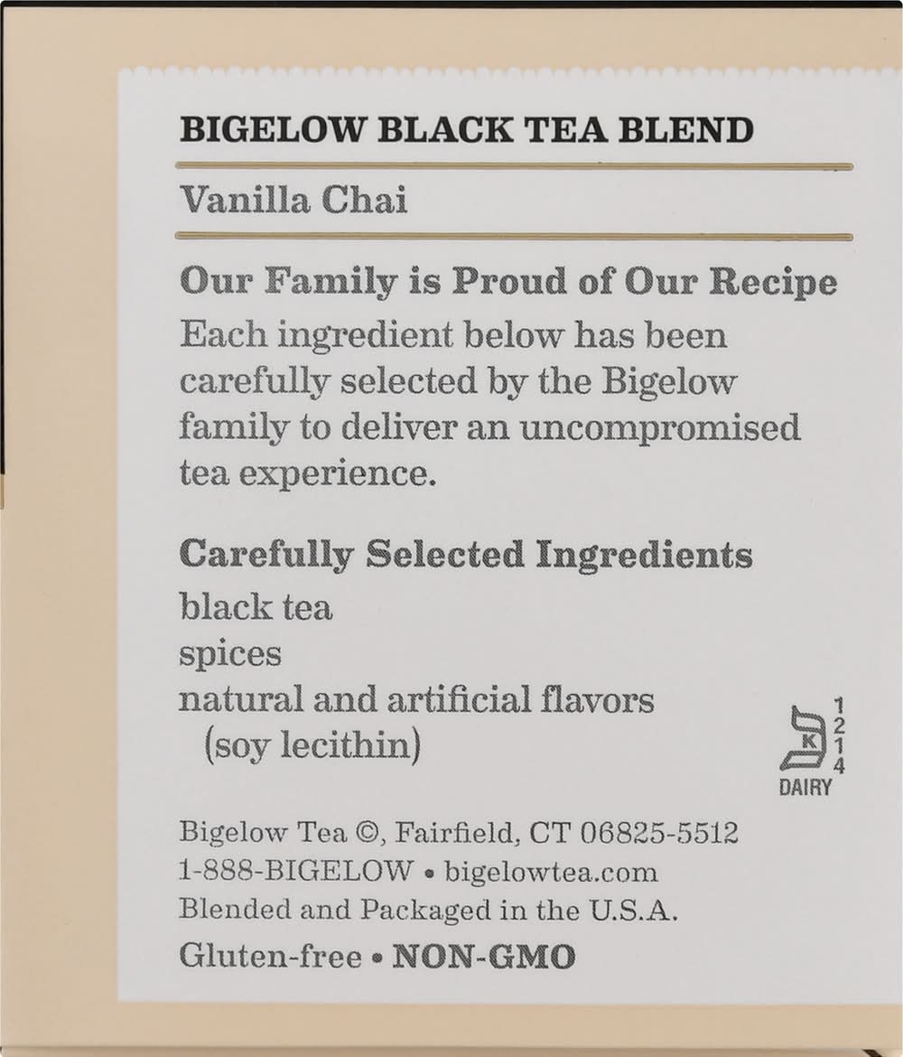Black Tea, Vanilla Chai, Bags • Bigelow Tea, Fairfield, CT, 06825-5512 • Packaging: Reusable