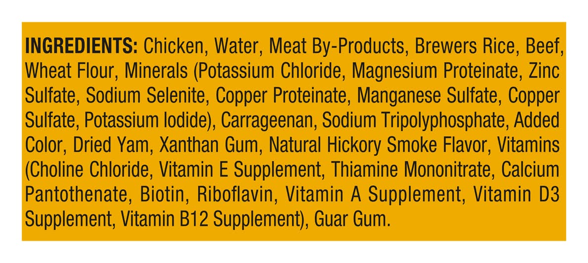 Ingredients: Chicken, Water, Meat By-Products, Brewers Rice, Beef, Wheat Flour, Minerals (Potassium Chloride, Magnesium Proteinate, Zinc Sulfate, Sodium Selenite, Copper Proteinate, Manganese Sulfate, Copper Sulfate, Potassium Iodide), Carrageenan, Sodium Tripolyphosphate, Added Color, Dried Yam, Xanthan Gum, Natural Hickory Smoke Flavor, Vitamins (Choline Chloride, Vitamin E Supplement, Thiamine Mononitrate, Calcium Pantothenate, Biotin, Riboflavin, Vitamin A Supplement, Vitamin D3 Supplement, Vitamin B12 Supplement), Guar Gum Contains: Wheat