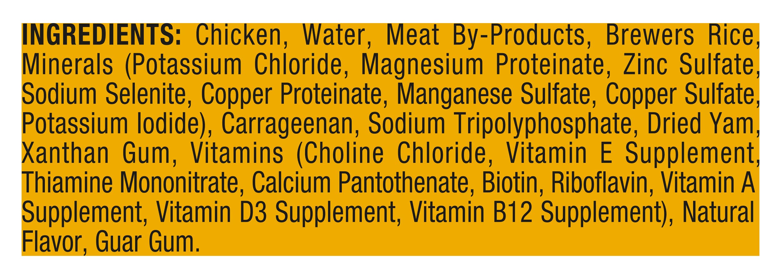 Ingredients: Chicken, Water, Meat By-Products, Brewers Rice, Minerals (Potassium Chloride, Magnesium Proteinate, Zinc Sulfate, Sodium Selenite, Copper Proteinate, Manganese Sulfate, Copper Sulfate, Potassium Iodide), Carrageenan, Sodium Tripolyphosphate, Dried Yam, Xanthan Gum, Vitamins (Choline Chloride, Vitamin E Supplement, Thiamine Mononitrate, Calcium Pantothenate, Biotin, Riboflavin, Vitamin A Supplement, Vitamin D3 Supplement, Vitamin B12 Supplement), Natural Flavor, Guar Gum