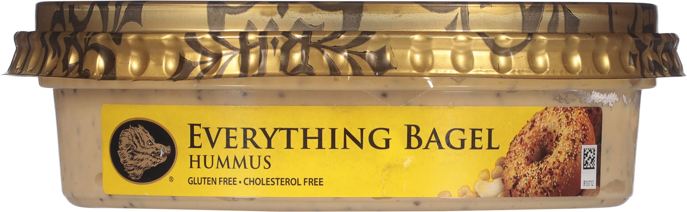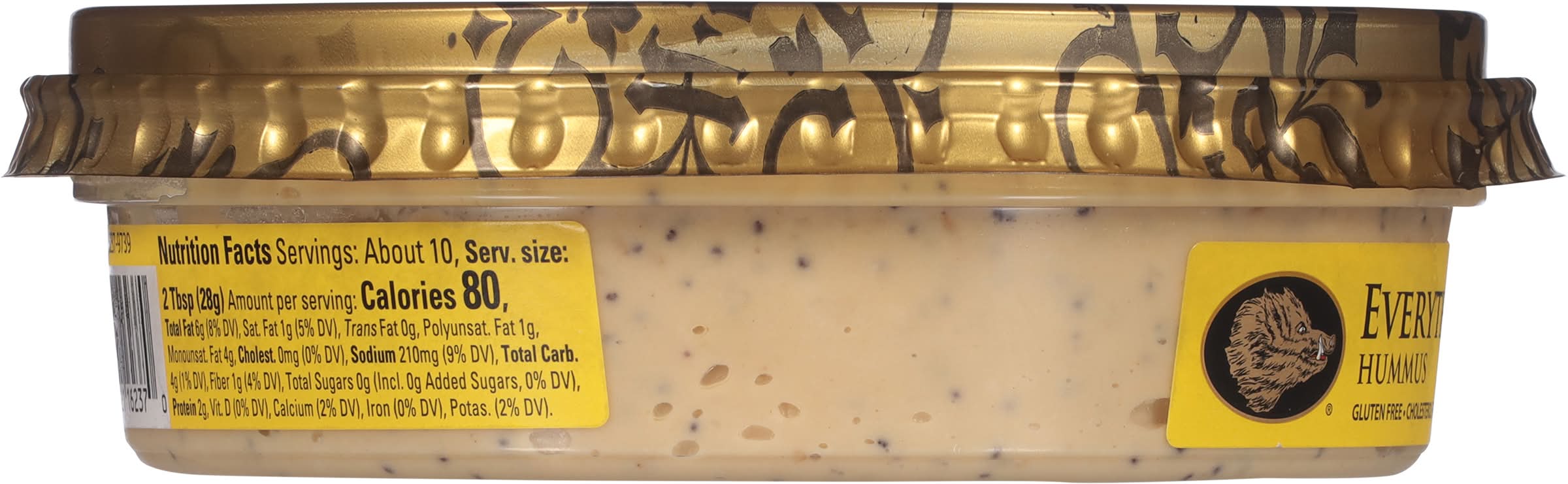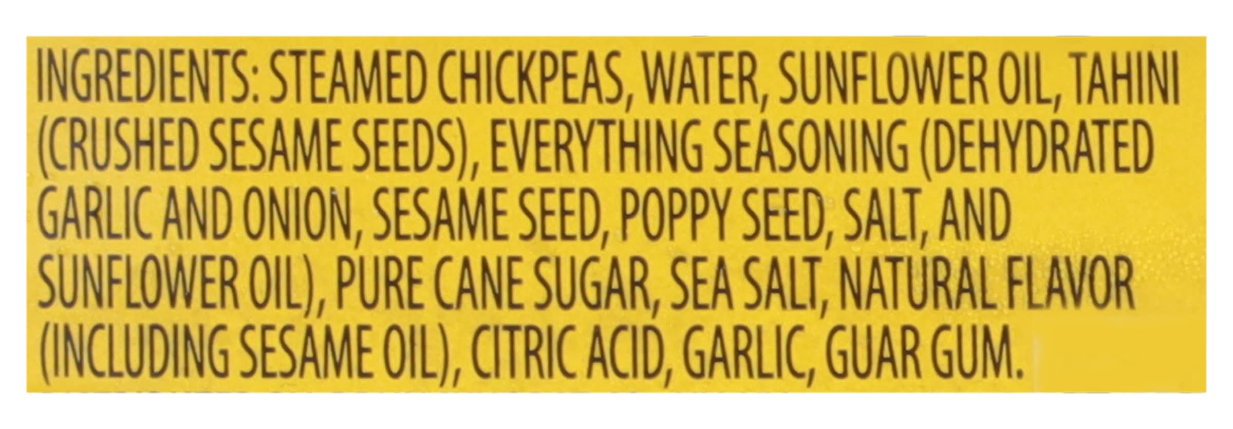 Ingredients: Steamed Chickpeas, Water, Sunflower Oil, Tahini (Crushed Sesame Seeds), Everything Seasoning (Dehydrated Garlic and Onion, Sesame Seed, Poppy Seed, Salt, and Sunflower Oil), Pure Cane Sugar, Sea Salt, Natural Flavor (Including Sesame Oil), Citric Acid, Garlic, Guar Gum Contains: Sesame
