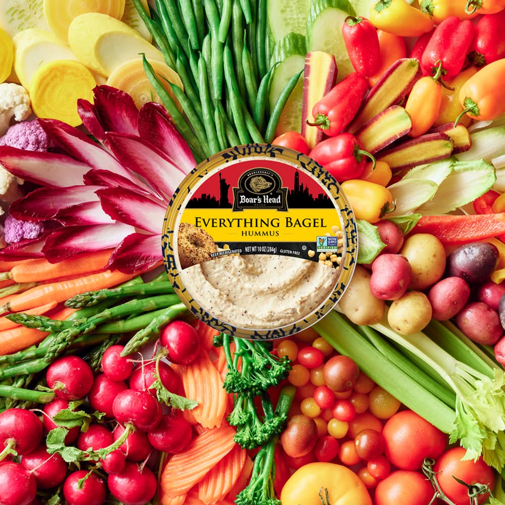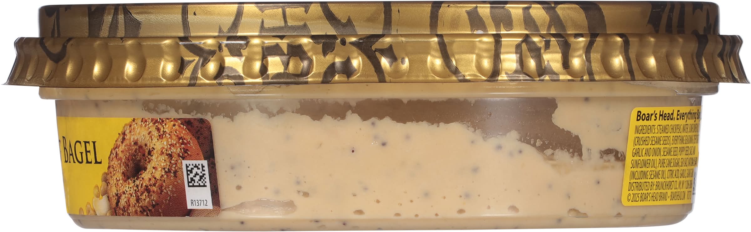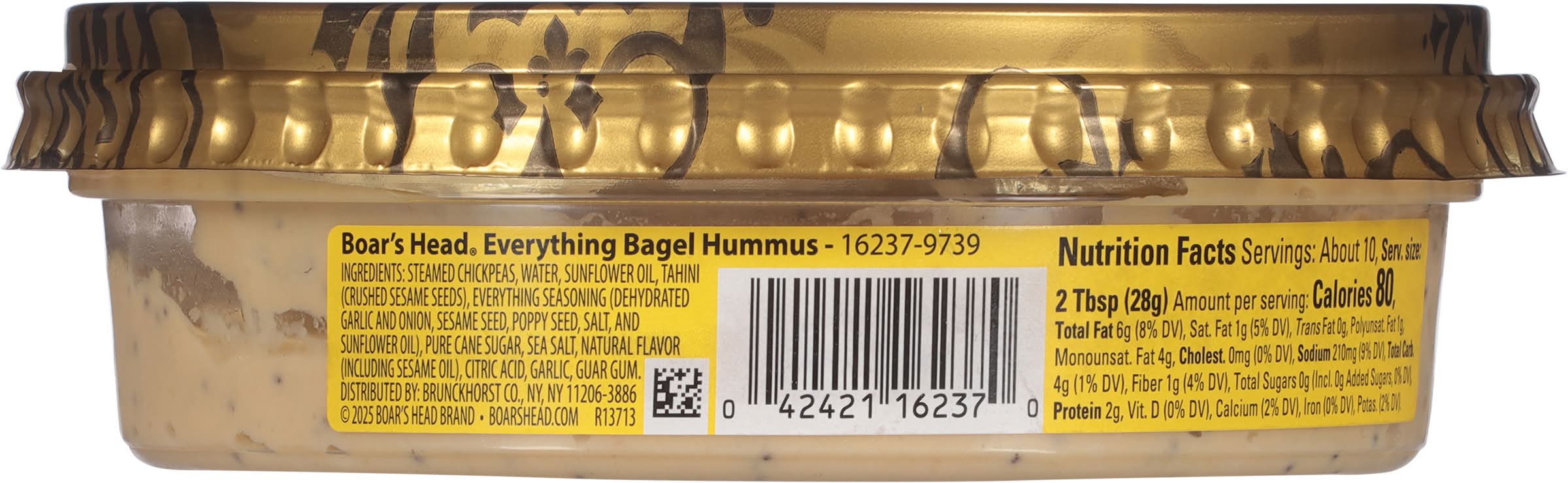 Ingredients: Steamed Chickpeas, Water, Sunflower Oil, Tahini (Crushed Sesame Seeds), Everything Seasoning (Dehydrated Garlic and Onion, Sesame Seed, Poppy Seed, Salt, and Sunflower Oil), Pure Cane Sugar, Sea Salt, Natural Flavor (Including Sesame Oil), Citric Acid, Garlic, Guar Gum Contains: Sesame
