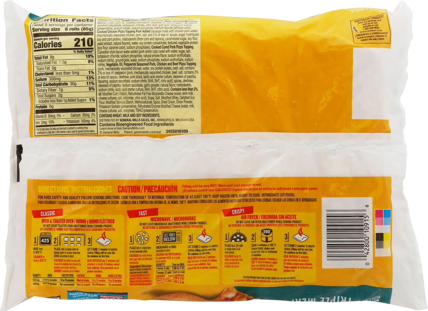 Directions for use: Cook thoroughly. Directions: For food safety and quality follow cooking directions. Cook thoroughly to internal temperature of at least 160 degrees F. Keep Frozen until ready to cook. Refrigerate leftovers. Classic: Oven & Toaster Oven - Do not leave toaster oven unattended while cooking product: (1) Heat oven to 425 degrees F. (2) Place rolls in single layer on baking sheet or toaster oven tray. Bake according to chart. (3) Let stand 2 minutes to complete cooking. Filling will be very hot. Be cautious on first bite. Quantity: Half bag; Oven 11 to 13 minutes; Toaster oven 14 to 16 minutes. Quantity: Full bag; Oven 14 to 16 minutes; Toaster oven not recommended. Fast: Microwave - Do not leave microwave unattended while cooking product: (1) Place rolls in single layer on microwavable plate. (2) Microwave on high according to chart. (3) Let stand 2 minutes to complete cooking. Filling will be very hot. Be cautious on first bite. Quantity: 1 serving (6 rolls); Time on high | 1:00 to 1:15. Quantity: 2 Servings (12 rolls); Time on high 2:00 to 2:40. Crispy: Air fryer – Do not leave air fryer unattended while cooking product: (1) Place up to 25 rolls in single layer in air fryer basket. (2) Cook 4 minutes at 390 degrees F. Remove basket, shake well to mix rolls. Cook an additional 4 minutes. (3) Let stand 2 minutes to complete cooking. Filling will be very hot. Be cautious on first bite. Directions developed using 4 quart air fryers, cooking times may need to be adjusted. Caution: Filling will be very hot! Wait until cool enough to eat. Keep frozen. Storage recommendation: Keep frozen. Keep frozen until ready to cook. Refrigerate leftovers.
