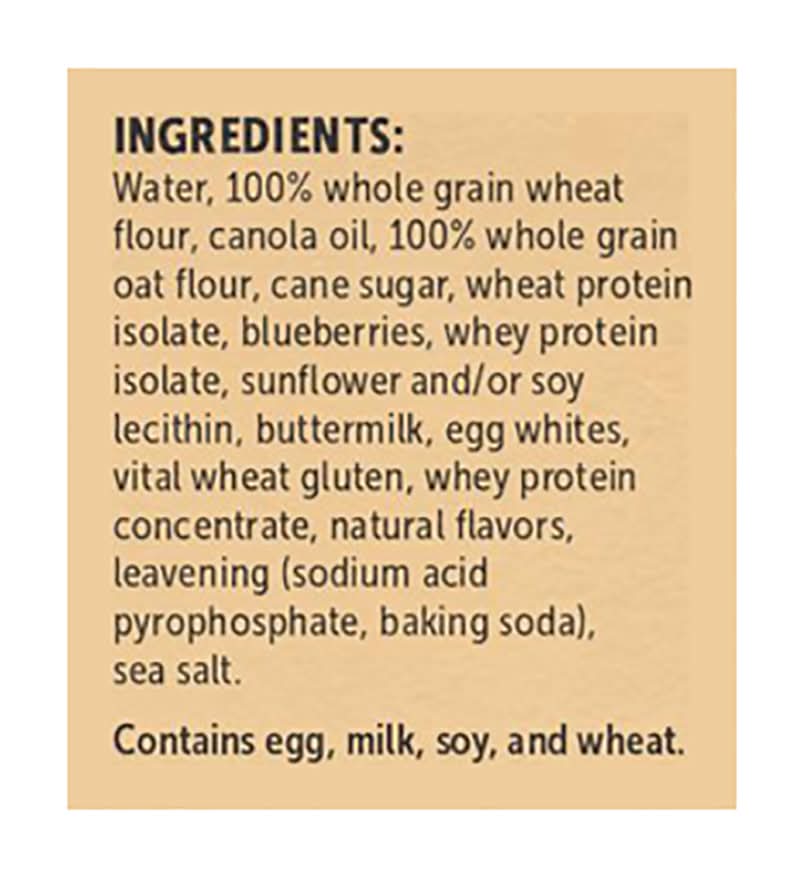 Ingredients: Water, 100% Whole Grain Wheat Flour, Canola Oil, 100% Whole Grain Oat Flour, Cane Sugar, Wheat Protein Isolate, Blueberries, Whey Protein Isolate, Sunflower and/or Soy Lecithin, Buttermilk, Egg Whites, Vital Wheat Gluten, Whey Protein Concentrate, Natural Flavors, Leavening (Sodium Acid Pyrophosphate, Baking Soda), Sea Salt Contains: Eggs, Milk, Soybeans, Wheat, Gluten, Oat