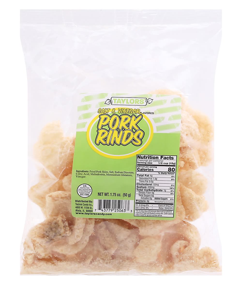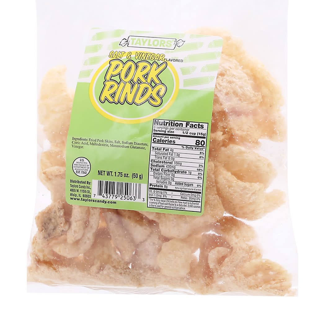 Pork Rinds, Salt & Vinegar Flavored • Brand: Taylor's • Flavor: Salt - vinegar • Number of servings: 3