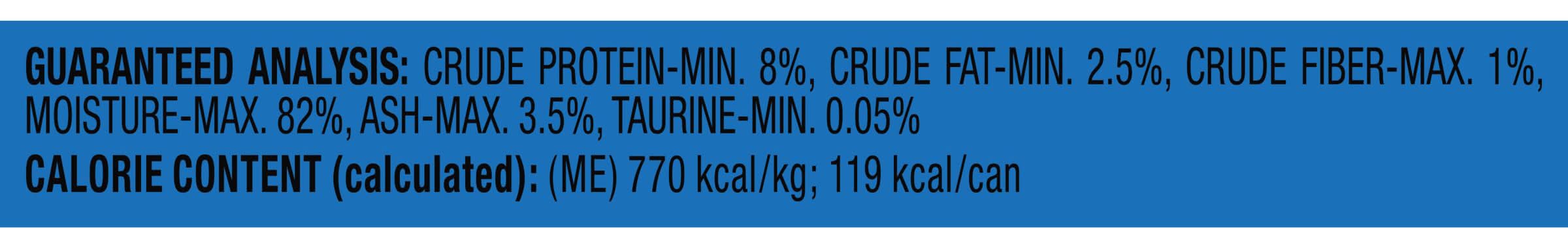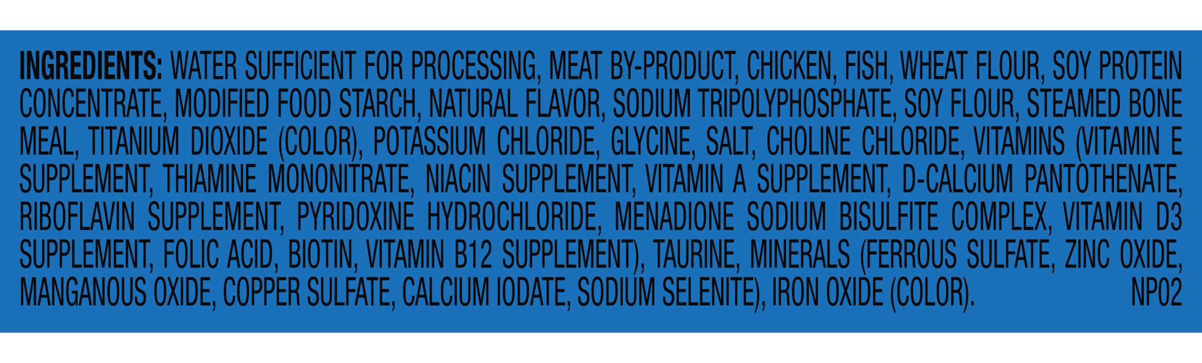 Ingredients: Water Sufficient For Processing, Chicken, Meat By-products, Liver, Soy Flour, Wheat Gluten, Modified Food Starch, Fish, Natural Flavor, Calcium Carbonate, Sodium Tripolyphosphate, Titanium Dioxide (color), Potassium Chloride, Salt, Bone Phosphate, Vitamins (vitamin E Supplement, Thiamine Mononitrate, Niacin, Vitamin A Supplement, D-calcium Pantothenate, Riboflavin Supplement, Pyridoxine Hydrochloride, Vitamin B12 Supplement, Menadione Sodium Bisulfite Complex, Vitamin D3 Supplement, Folic Acid, Biotin), Choline Chloride, Taurine, Minerals (ferrous Sulfate, Zinc Oxide, Manganous Oxide, Copper Sulfate, Calcium Iodate, Sodium Selenite), Iron Oxide (color), Thiamine Mononitrate