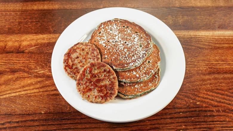 Three buttermilk flapjacks flavored with your choice of Banana Nut, Apple Cinnamon, Blueberry, Raspberry Walnut, or Chocolate Chip, served with a choice of meat.