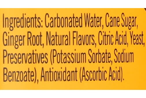 Ingredients: Carbonated Water, Cane Sugar, Ginger Root, Natural Flavors, Citric Acid, Yeast, Preservatives (Potassium Sorbate, Sodium Benzoate), Antioxidant (Ascorbic Acid)