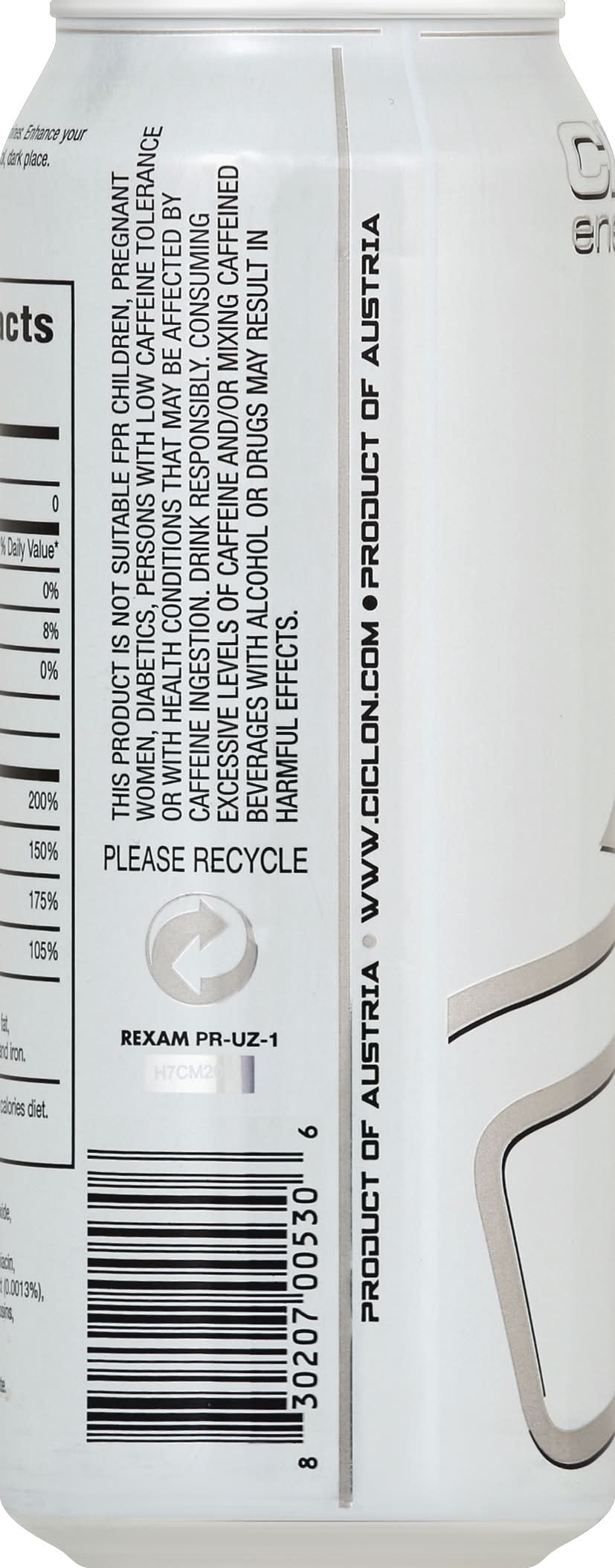 A refreshing energy drink with caffeine and vitamins. Enhance your personal performance! Pasteurized. Caffeine content 80 mg/8.3 fl oz. Please recycle. www.ciclon.com. Product of Austria. Packaging: Reusable