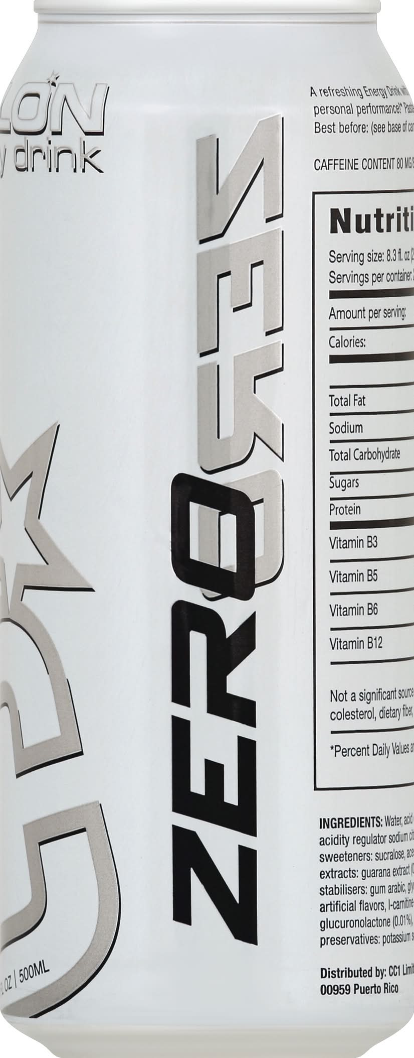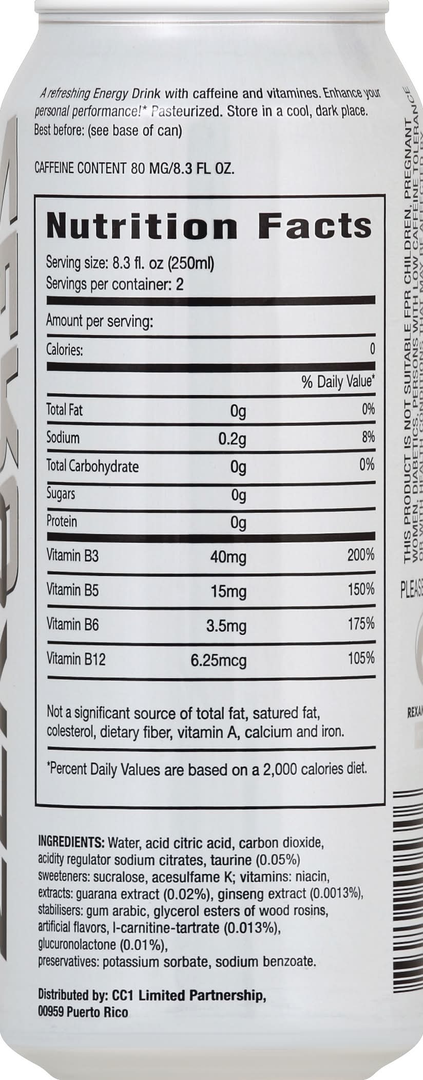 Ingredients: Water, Acid Citric Acid, Carbon Dioxide, Acidity Regulator Sodium Citrates, Taurine (0.05%) Sweeteners: Sucralose, Acesulfame K; Vitamins: Niacin, Extracts; Guarana Extract (0.02%), Ginseng Extract (0.0013%), Stabilisers: Gum Arabic, Glycerol Esters of Wood Rosins, Artificial Flavors, L-Carnitine-Tartrate (0.013%), Glucuronolactone (0.01%), Preservatives: Potassium Sorbate, Sodium Benzoate