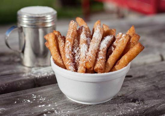 Funnel cake sticks dusted with powdered sugar, served with dipping sauce