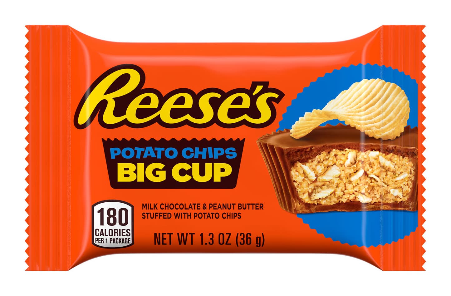 It's no joke! The salty, crunchy and crisp flavors of a classic potato chip are now stuffed inside famous REESE'S Big Cup Stuffed with Potato Chips Milk Chocolate Peanut Butter Cups. Bite into the unique flavor combination and experience one of the best food combos around. You can't go wrong with a salty and sweet mix of two iconic foods. Pack these REESE'S Big Cup candies into your lunch box for an afternoon treat, stack them in your pantry for an after-dinner dessert or have them ready for your next family movie night. You can even bring this pack of peanut butter cups along to the next sporting event as a concession treat, as movie marathon snacks or game night prizes. These gluten free and kosher REESE'S Big Cup milk chocolate peanut butter cups are the perfect sweet treats to share with friends, family members, co-workers and classmates, just don't forget to save a few for yourself! For the holidays, stuff Christmas stockings, fill Easter baskets, top Halloween candy bowls and add peanut butter cups to your Valentine's Day gift baskets. Want to liven up your baked goods? Crumble a few of these REESE'S peanut butter cups into your brownie, cupcake or fudge bar mix for a salty and sweet addition. • Brand: Reese's • gluten-free • The Hershey Company, Hershey, PA, 17033-0815
