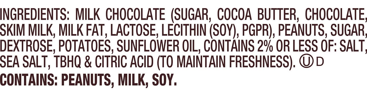 Ingredients: MILK CHOCOLATE, SUGAR, COCOA BUTTER, CHOCOLATE, SKIM MILK, MILK FAT, LACTOSE, LECITHIN (SOY), PGPR, PEANUTS, SUGAR, DEXTROSE, POTATOES, SUNFLOWER OIL, CONTAINS 2% OR LESS OF: SALT, SEA SALT, TBHQ CITRIC ACID (TO MAINTAIN FRESHNESS), . Contains: Contains: Peanuts|Soy|Milk