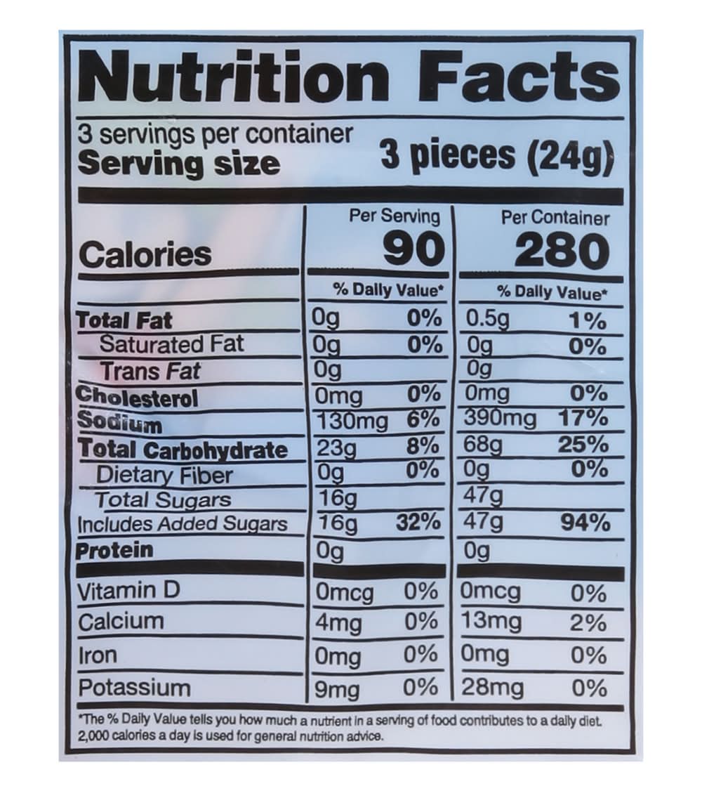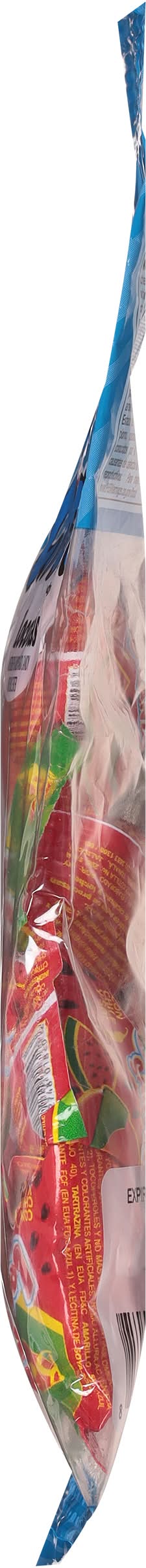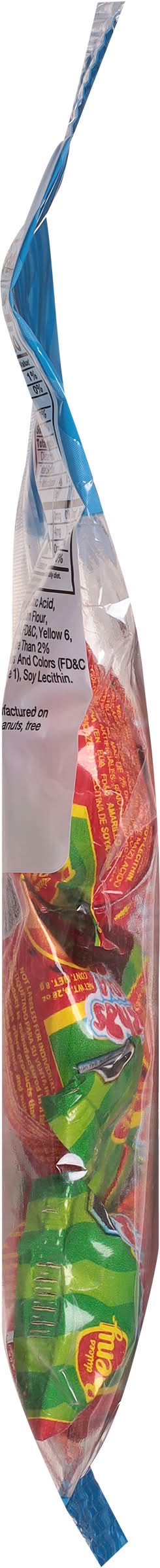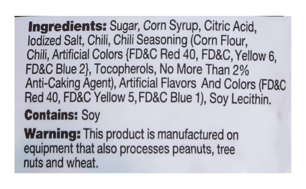 Ingredients: Sugar, Corn Syrup, Citric Acid, Iodized Salt, Chili, Chili Seasoning (Corn Flour, Chili, Artificial Colors {FD&C Red 40, FD&C, Yellow 6, FD&C Blue 2}, Tocopherols, No More than 2% Anti-Caking Agent), Artificial Flavors and Colors (FD&C Red 40, FD&C Yellow 5, FD&C Blue 1), Soy Lecithin Contains: Corn, Soybeans, Peanuts, Tree Nuts, Wheat