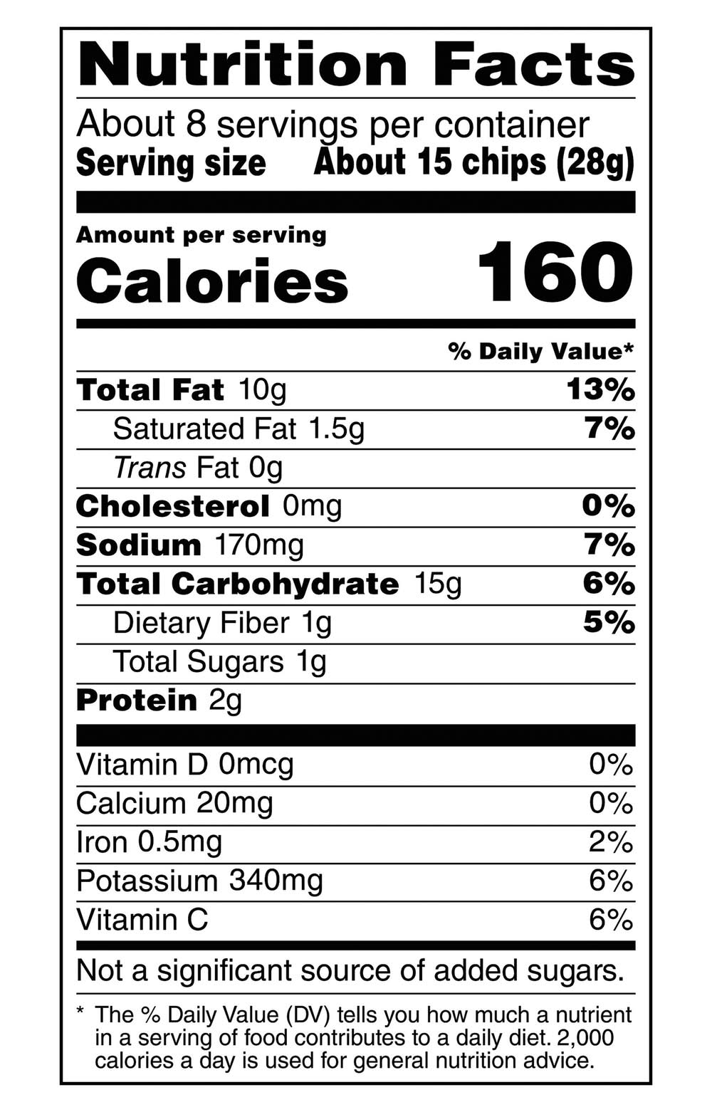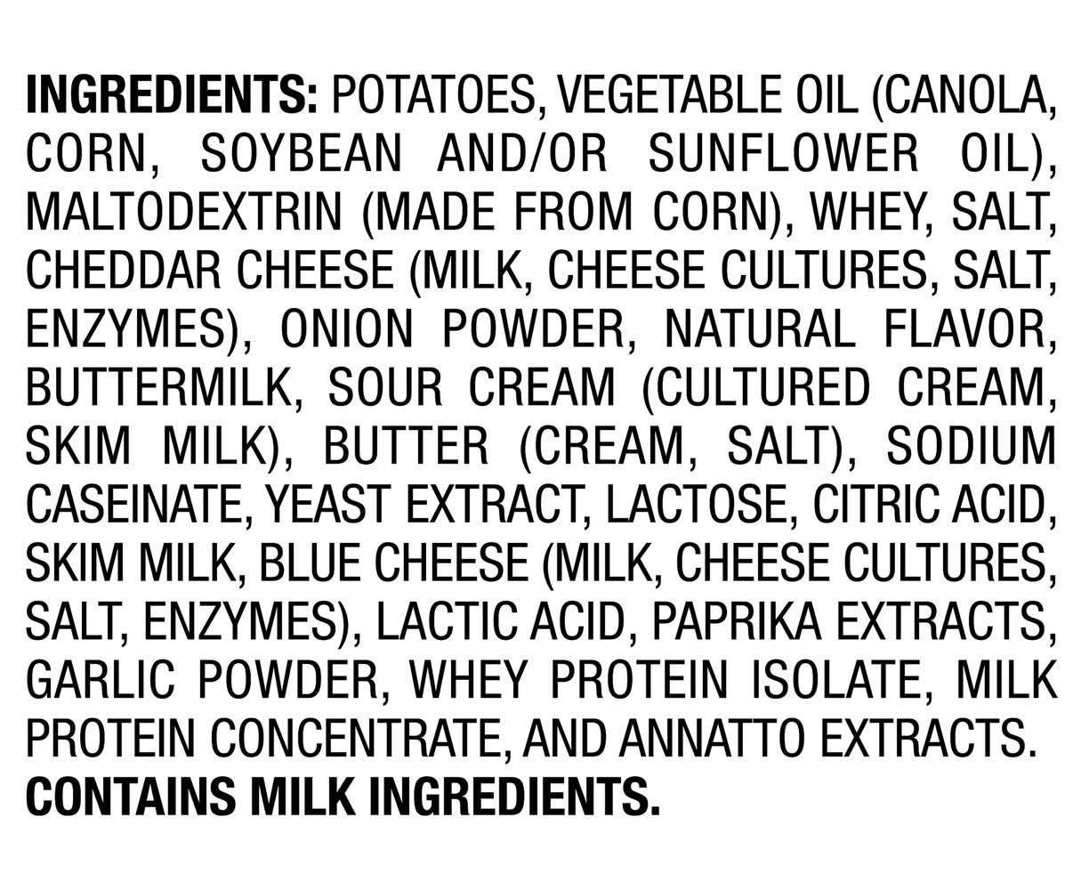 Ingredients: Potatoes, Vegetable Oil (Canola, Corn, Soybean and/or Sunflower Oil), Maltodextrin (Made from Corn), Whey, Salt, Cheddar Cheese (Milk, Cheese Cultures, Salt, Enzymes), Onion Powder, Natural Flavor, Buttermilk, Sour Cream (Cultured Cream, Skim Milk), Butter (Cream, Salt), Sodium Caseinate, Yeast Extract, Lactose, Citric Acid, Skim Milk, Blue Cheese (Milk, Cheese Cultures, Salt, Enzymes), Lactic Acid, Paprika Extracts, Garlic Powder, Whey Protein Isolate, Milk Protein Concentrate, and Annatto Extracts Contains: MILK, Corn, Soybeans, Lactose