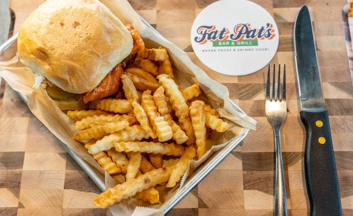 Two hand-battered chicken tenders. Tossed in our spicy sizzle sauce with pickles and dressed with Fat Pat's sauce
