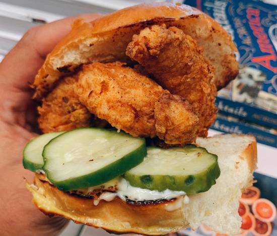 Fried Chicken Breast, red pepper aioli, pickles, brioche bun - comes with fries