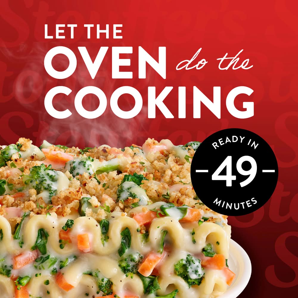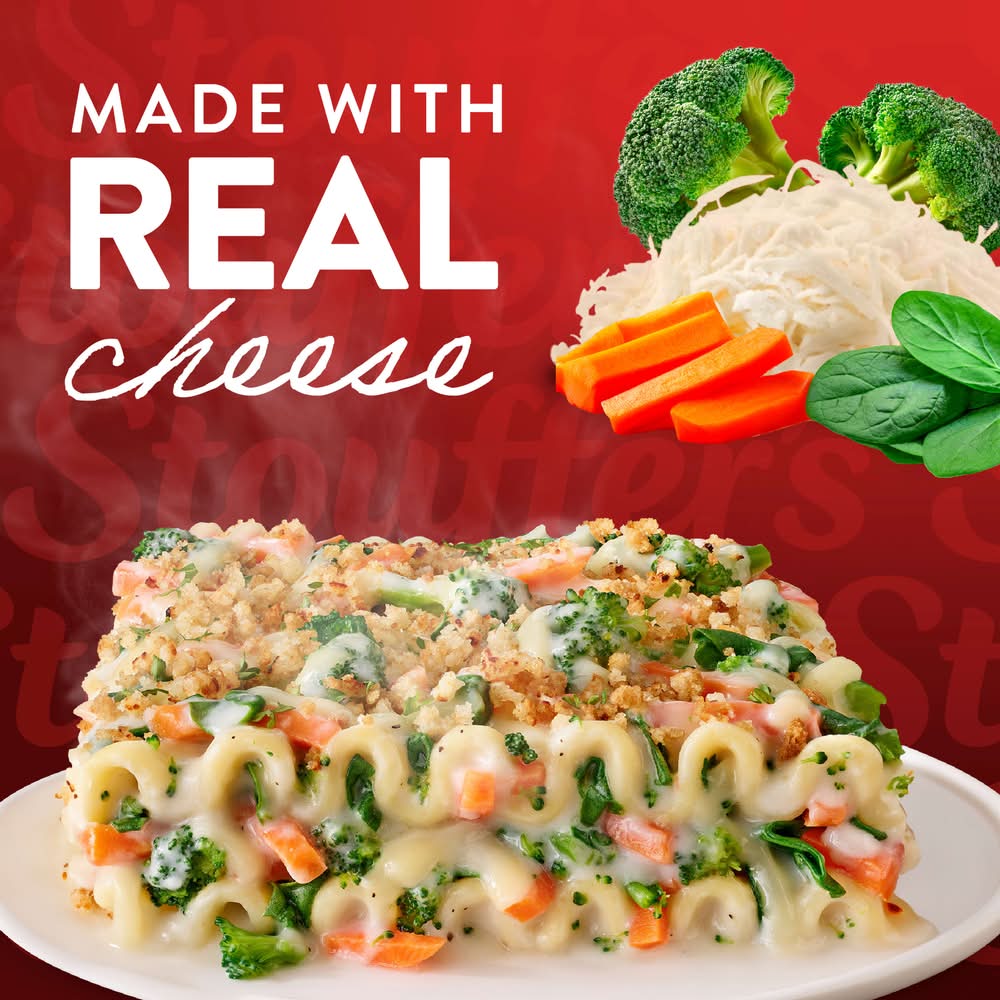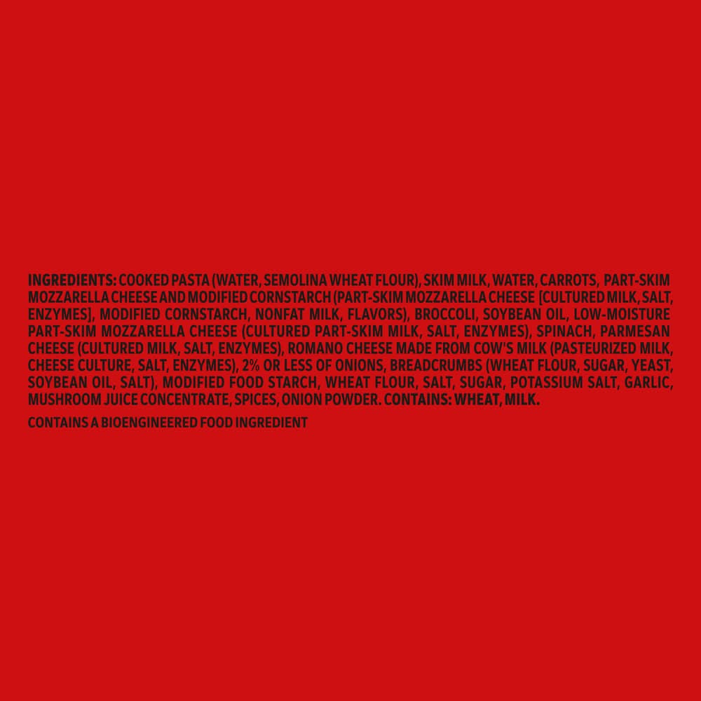 Ingredients: COOKED PASTA (WATER, SEMOLINA WHEAT FLOUR), SKIM MILK, WATER, CARROTS, PART-SKIM MOZZARELLA CHEESE AND MODIFIED CORNSTARCH (PART-SKIM MOZZARELLA CHEESE [CULTURED MILK, SALT, ENZYMES], MODIFIED CORNSTARCH, NONFAT MILK, FLAVORS), BROCCOLI, SOYBEAN OIL, LOW-MOISTURE PART-SKIM MOZZARELLA CHEESE (CULTURED PART-SKIM MILK, SALT, ENZYMES), SPINACH, PARMESAN CHEESE (CULTURED MILK, SALT, ENZYMES), ROMANO CHEESE MADE FROM COW'S MILK (PASTEURIZED MILK, CHEESE CULTURE, SALT, ENZYMES), 2% OR LESS OF ONIONS, BREADCRUMBS (WHEAT FLOUR, SUGAR, YEAST, SOYBEAN OIL, SALT), MODIFIED FOOD STARCH, WHEAT FLOUR, SALT, SUGAR, POTASSIUM SALT, GARLIC, MUSHROOM JUICE CONCENTRATE, SPICES, ONION POWDER. Contains: Wheat, Milk, Corn, Soybeans