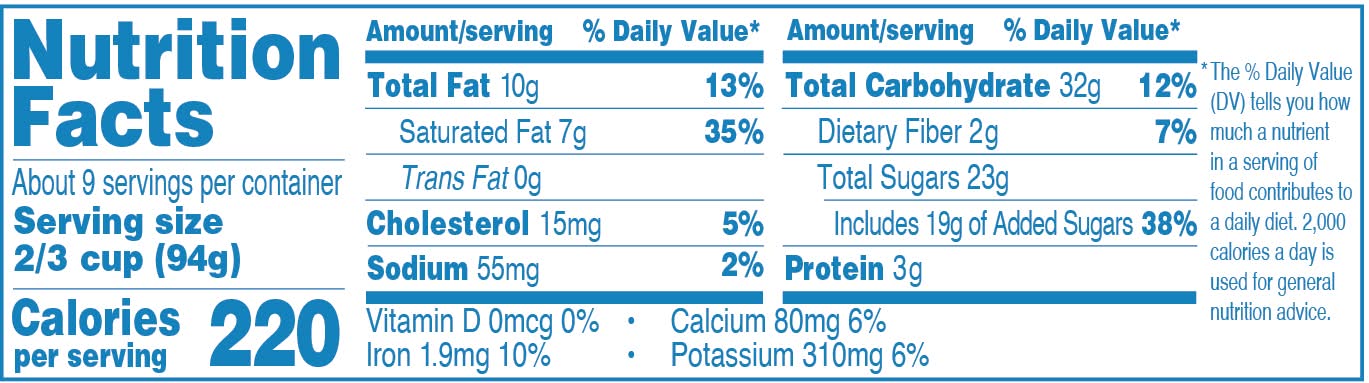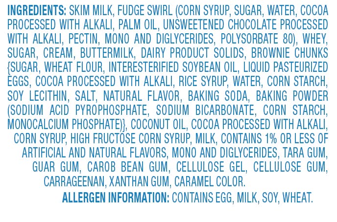 Ingredients: Skim Milk, Fudge Swirl (Corn Syrup, Sugar, Water, Cocoa Processed with Alkali, Palm Oil, Unsweetened Chocolate Processed with Alkali, Pectin, Mono and Diglycerides, Polysorbate 80), Whey, Sugar, Cream, Buttermilk, Dairy Product Solids, Brownie Chunks {Sugar, Wheat Flour, Interesterified Soybean Oil, Liquid Pasteurized Eggs, Cocoa Processed with Alkali, Rice Syrup, Water, Corn Starch, Soy Lecithin, Salt, Natural Flavor, Baking Soda, Baking Powder (Sodium Acid Pyrophosphate, Sodium Bicarbonate, Corn Starch, Monocalcium Phosphate)}, Coconut Oil, Cocoa Processed with Alkali, Corn Syrup, High Fructose Corn Syrup, Milk, Contains 1% or less of Artificial and Natural Flavors, Mono and Diglycerides, Tara Gum, Guar Gum, Carob Bean Gum, Cellulose Gel, Cellulose Gum, Carrageenan, Xanthan Gum, Caramel Color. Contains: Eggs, Milk, Soybeans, Wheat, Corn
