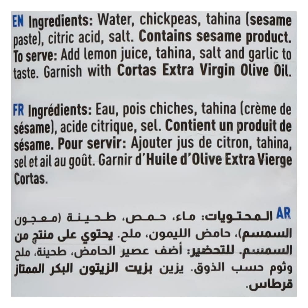 Ingredients: Water, Chickpeas, Tahina (Sesame Paste), Citric Acid, Salt Contains: Sesame