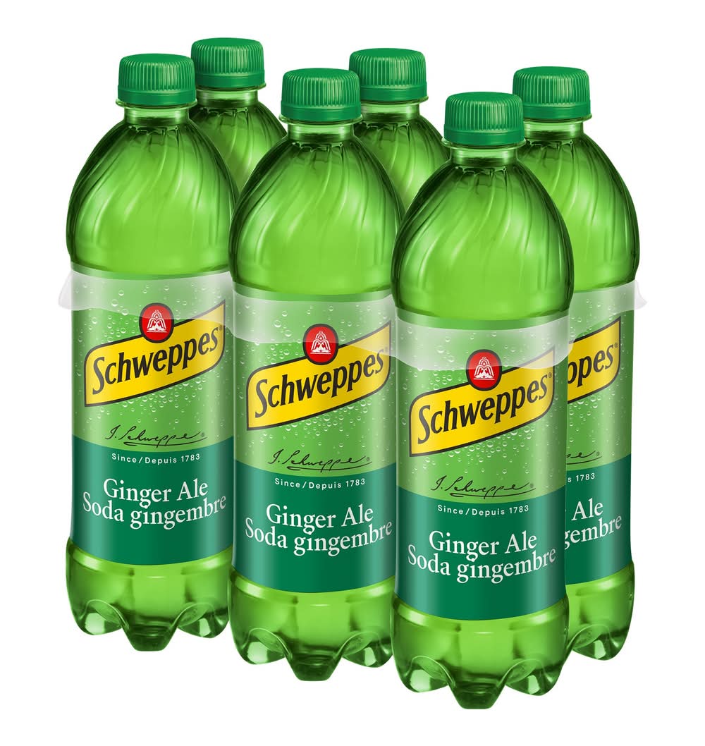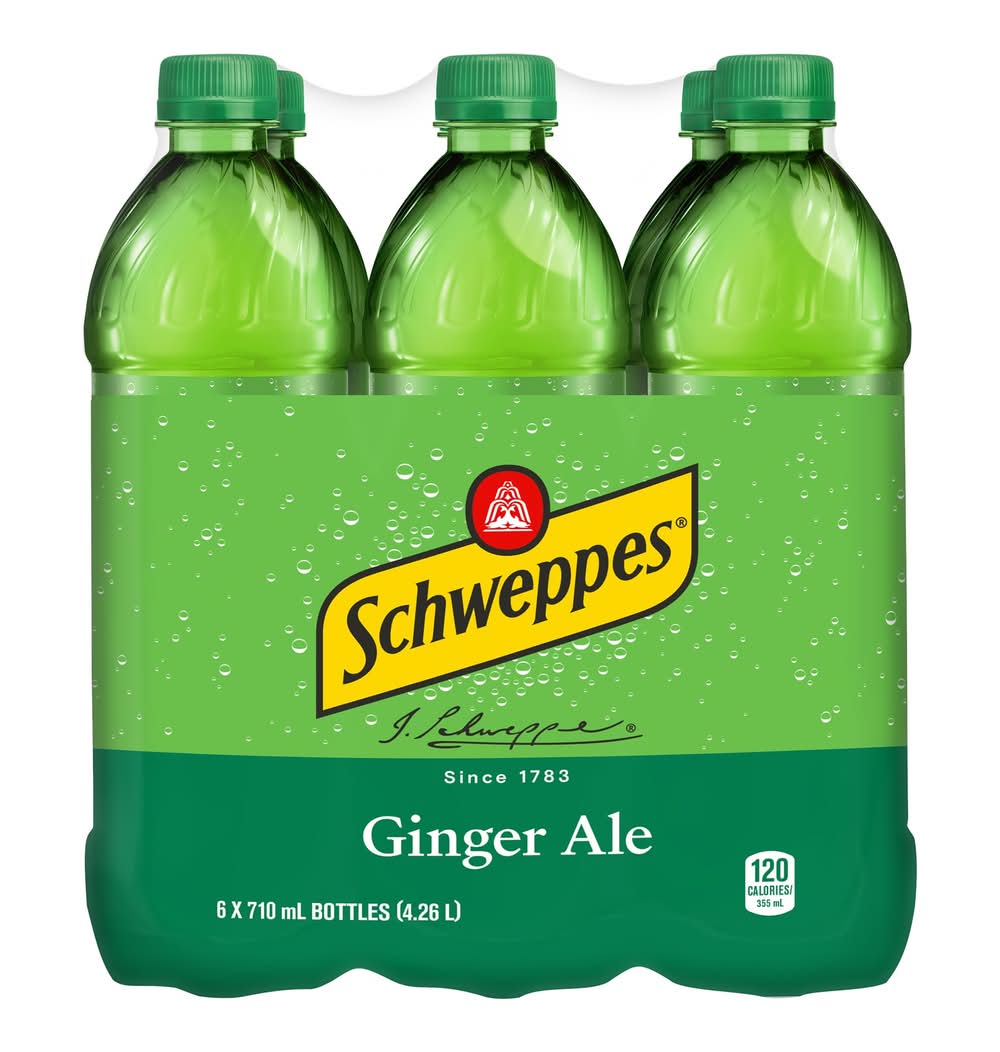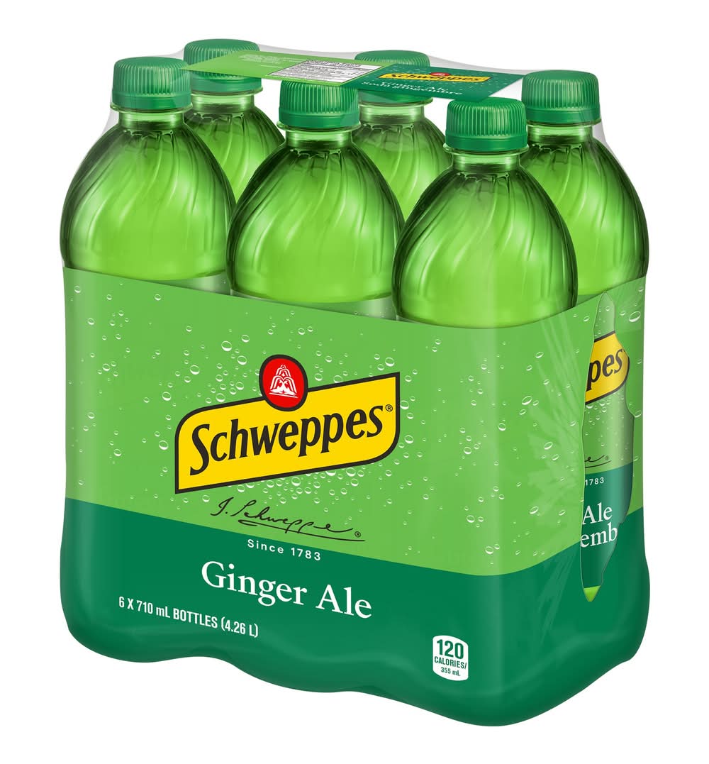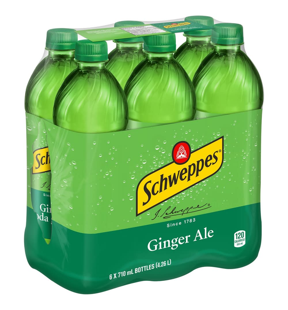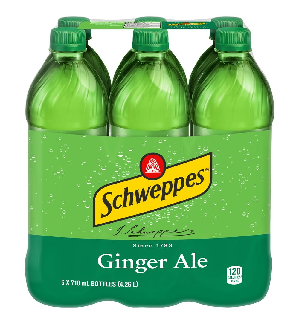 Schweppes Ginger Ale Soda Gingembre is a beverage suitable for drinking, featuring a distinct ginger ale flavor. Each pack contains multiple 710 ml containers, conveniently packaged for ease of consumption and storage. Pack size: 6