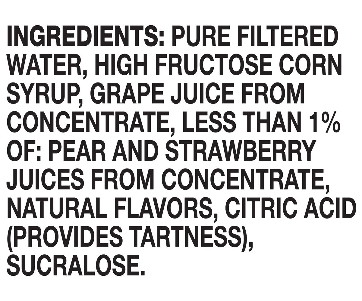 Ingredients: Pure Filtered Water, High Fructose Corn Syrup, Grape Juice From Concentrate, Less Than 1% Of: Pear And Strawberry Juices From Concentrate, Natural Flavors, Citric Acid (Provides Tartness), Sucralose.