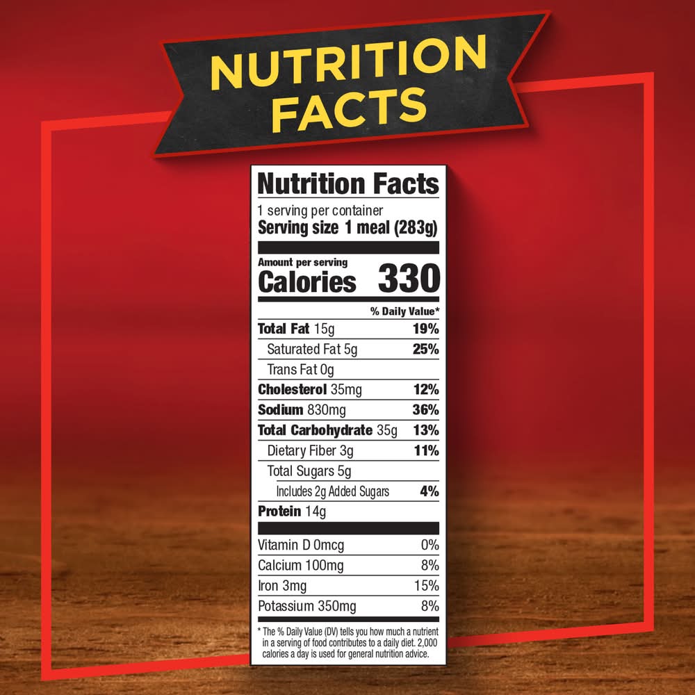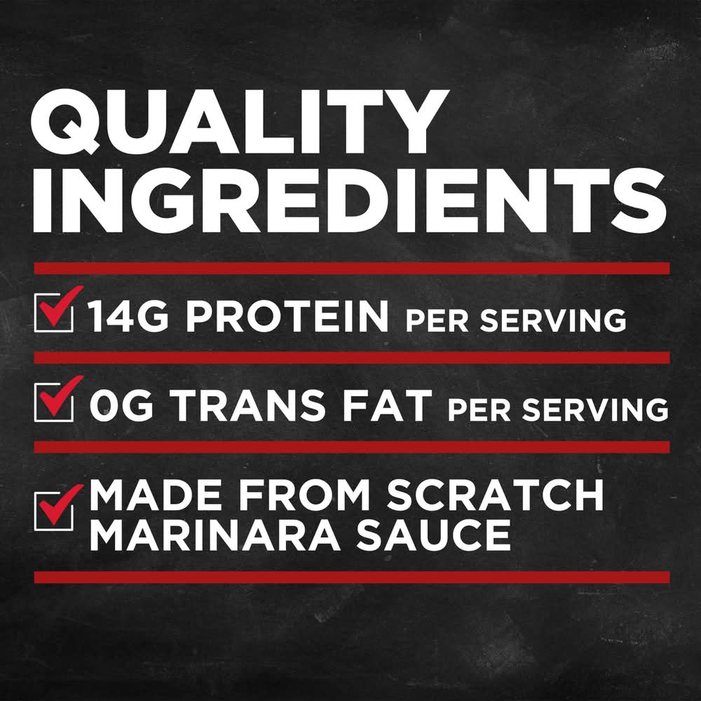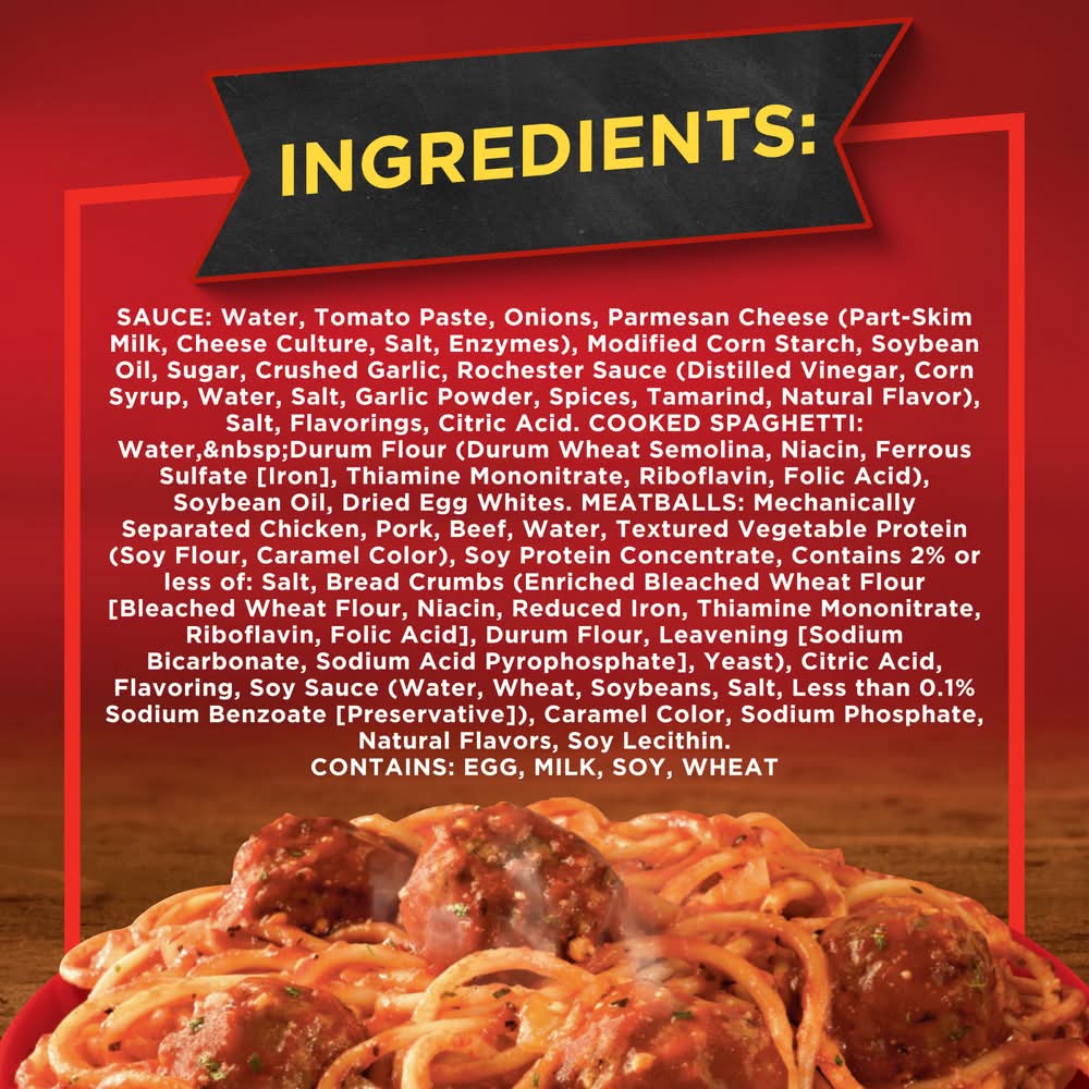 Ingredients: SAUCE: Water, Tomato Paste, Onions, Parmesan Cheese (Part-Skim Milk, Cheese Culture, Salt, Enzymes), Modified Corn Starch, Soybean Oil, Sugar, Crushed Garlic, Rochester Sauce (Distilled Vinegar, Corn Syrup, Water, Salt, Garlic Powder, Spices, Tamarind, Natural Flavor), Salt, Flavorings, Citric Acid. COOKED SPAGHETTI: Water, Durum Flour (Durum Wheat Semolina, Niacin, Ferrous Sulfate [Iron], Thiamine Mononitrate, Riboflavin, Folic Acid), Soybean Oil, Dried Egg Whites. MEATBALLS: Mechanically Separated Chicken, Pork, Beef, Water, Textured Vegetable Protein (Soy Flour, Caramel Color), Soy Protein Concentrate, Contains 2% or less of: Salt, Bread Crumbs (Enriched Bleached Wheat Flour [Bleached Wheat Flour, Niacin, Reduced Iron, Thiamine Mononitrate, Riboflavin, Folic Acid], Durum Flour, Leavening [Sodium Bicarbonate, Sodium Acid Pyrophosphate], Yeast), Citric Acid, Flavoring, Soy Sauce (Water, Wheat, Soybeans, Salt, Less than 0.1% Sodium Benzoate [Preservative]), Caramel Color, Sodium Phosphate, Natural Flavors, Soy Lecithin. CONTAINS: EGG, MILK, SOY, WHEAT Contains: Celery (EU), Egg, Milk, Soy, Wheat