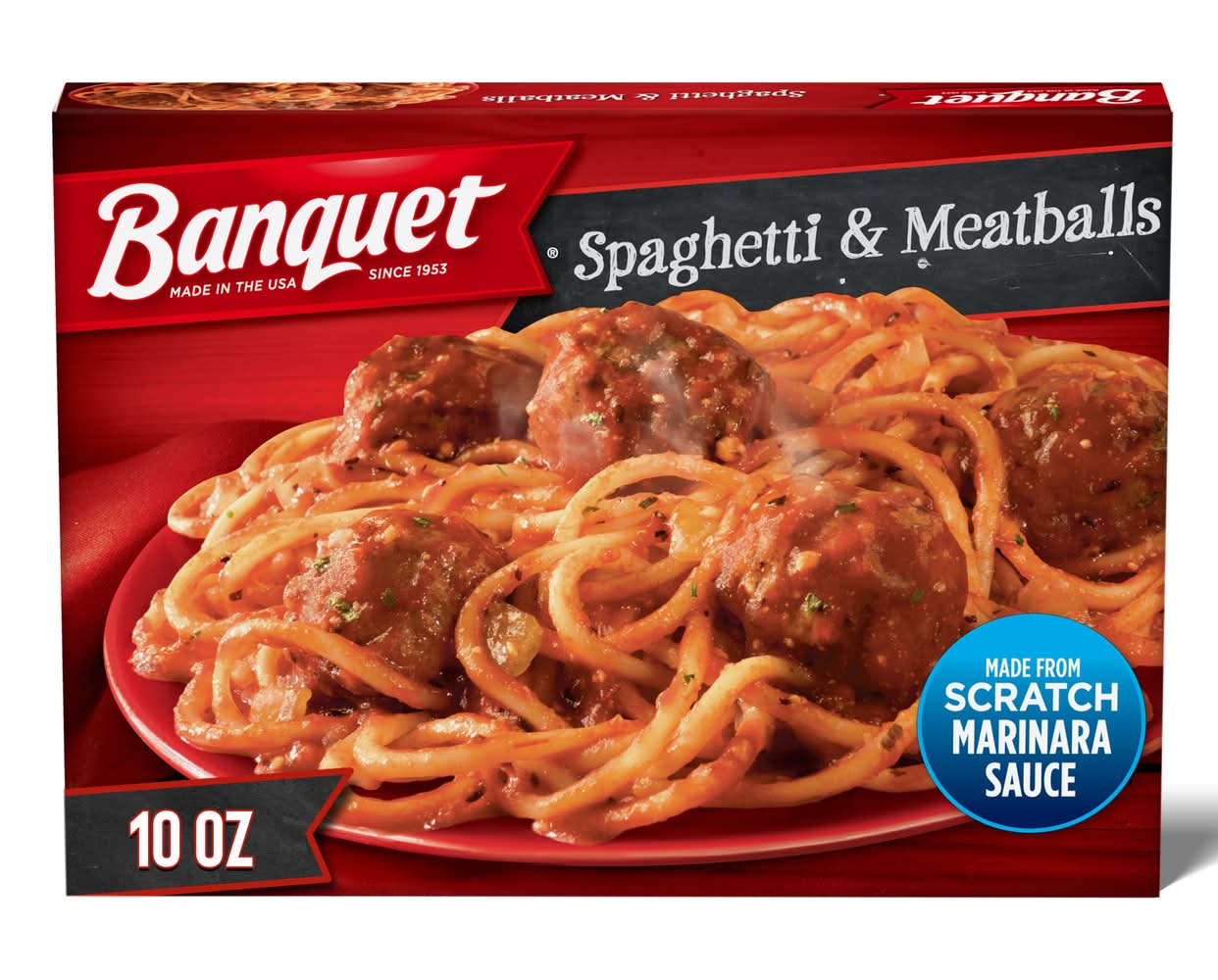 Banquet Spaghetti and Meatballs frozen meal brings the home-cooked flavor to your table in minutes. This frozen dinner features spaghetti noodles with meatballs and marinara sauce for delicious ready made meals. Enjoy Banquet frozen meals as convenient frozen lunches, or quick dinners when you're in the mood for spaghetti and meatballs. Preparation of frozen prepared meals is quick and easy. Follow the instructions on the package to prepare frozen dinners in the oven for fresh-baked taste or microwave for a quicker cook time. Store the 10 ounce spaghetti and meatballs meal in the freezer until you’re ready to enjoy frozen entrees. Proudly made in the U.S.A. for over 60 years, Banquet has been making delicious food the whole family loves. • Size: 10 OZ • Conagra Brands, PO Box 3534,Chicago,IL,60654