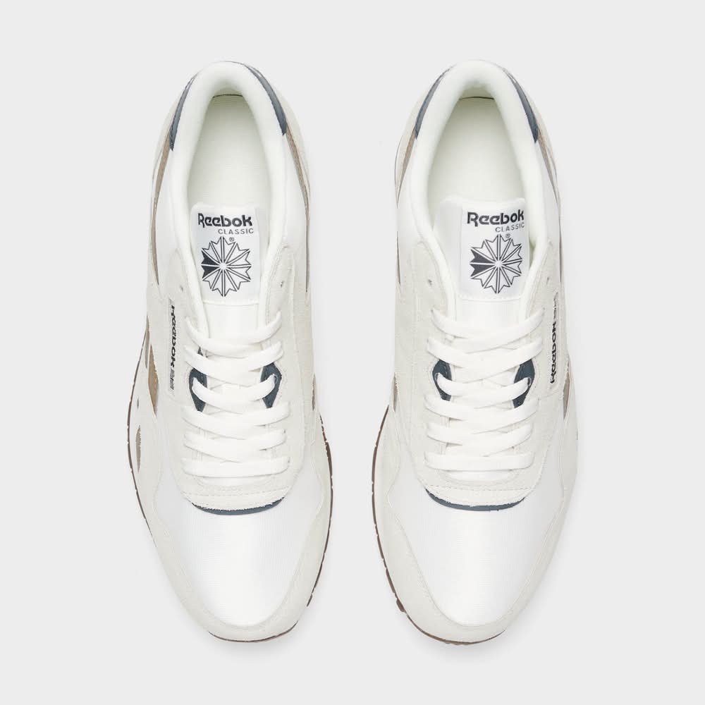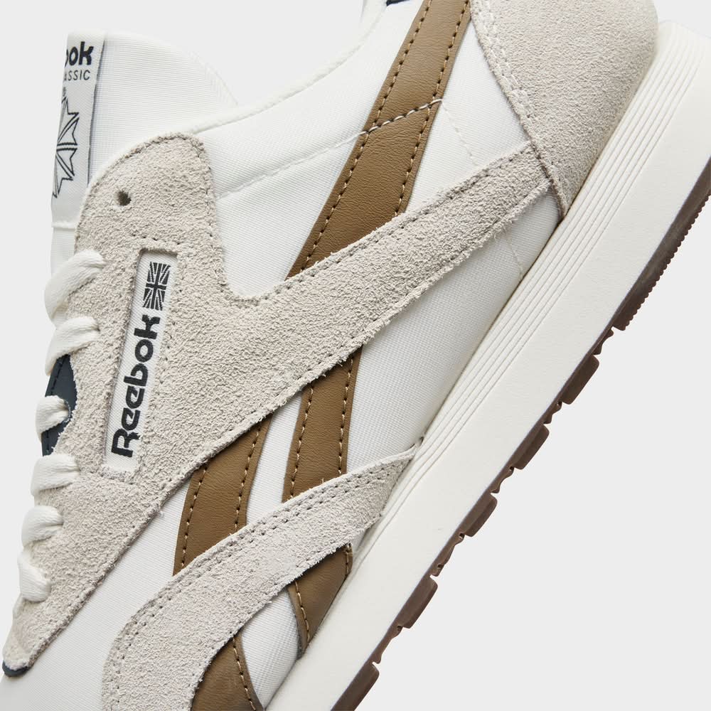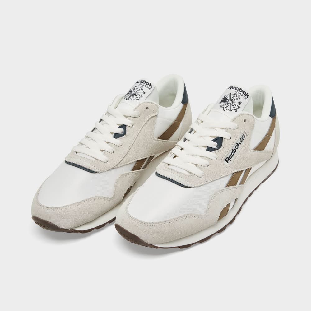 Many in stockLow-profile retro running sneaker Nylon upper with suede overlays Retro on midfoot panel and tongue Classic lace-up design EVA midsole for cushioned comfort High abrasion rubber outsole offers traction The Reebok Classic Nylon is imported. Timeless design meets durable materials in the Crisp, clean and understated style mark the Classic Nylon as a favorite pair to lace up for everything from grabbing groceries to stepping out with friends for a refined lifestyle look you can always count on. • Color: Chalk/utility brown/beige • Size: 8.5