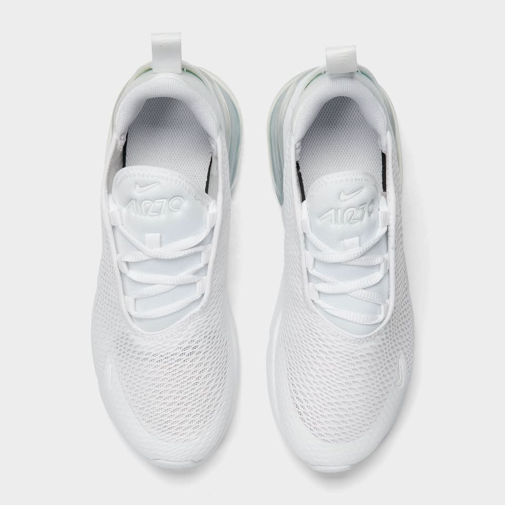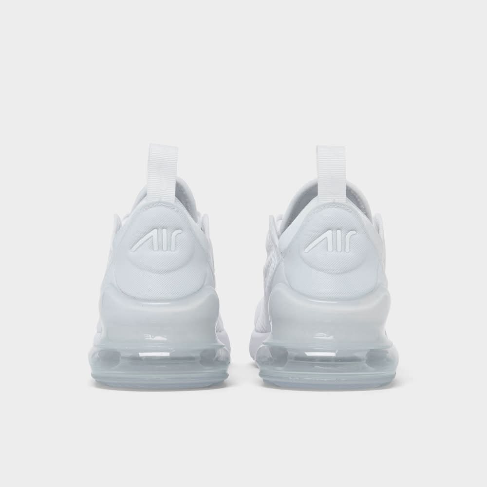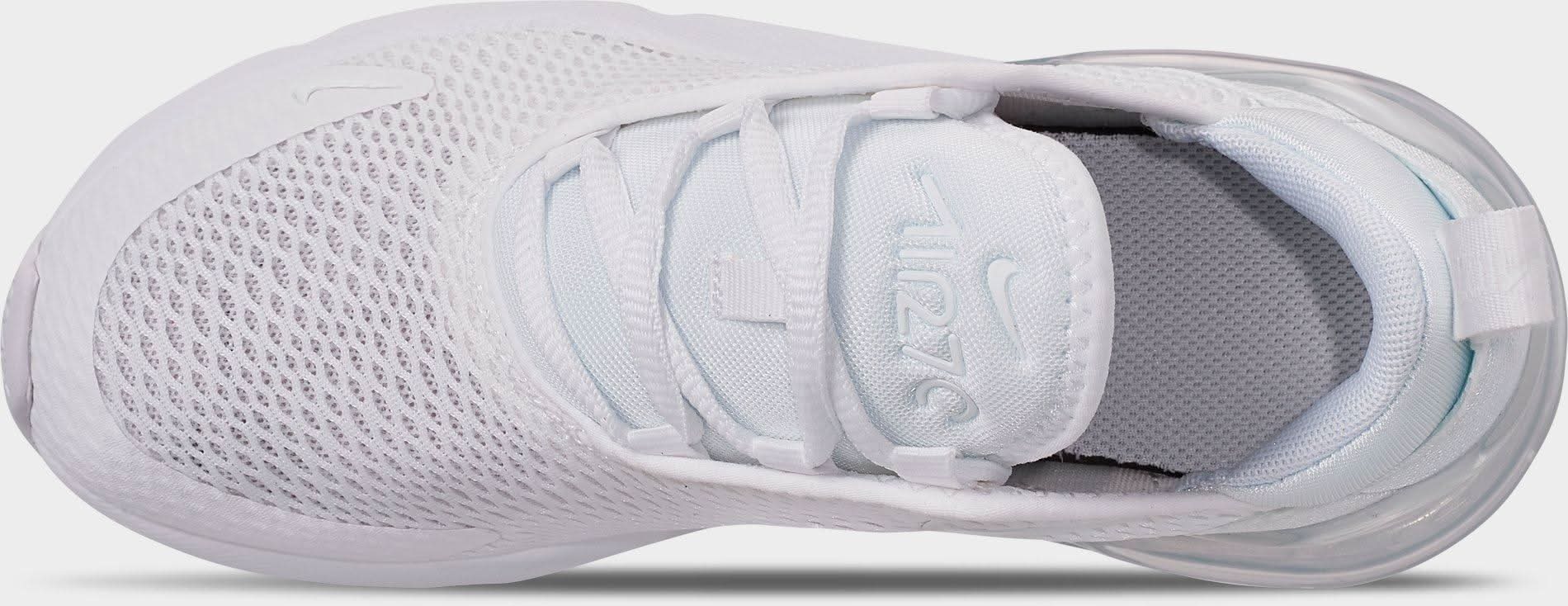 Lightweight textile material with breathable mesh panels and supportive smooth, patent synthetic overlays Versatile low profile with heel pull tab for an easy on and off Protective bumper toe Classic branding for Nike's signature touch Foot-hugging neoprene stretch bootie construction Secure webbed lace panel with tie lace closure Elevated comfort system offers a plush midsole and large-volume Max Air unit High-traction grippy rubber sole with flex grooves The Nike Air Max 270 Casual Shoes are imported. The updated Little Kids' Nike Air Max 270 Casual Shoes hit the scene in early 2018, offering an oversized Max Air unit for larger-than-life comfort. Billed as the Air Max specifically intended for the streets, this fresh-out-the-box model features a blend of the Air Max 180 and 93 with a 270-degree Max Air unit. Blanketed with a lightweight textile and synthetic material, their exaggerated silhouette and heritage looks offer a nostalgic-meets-modern vibe. From the playground to the park to the museum, they can get the plush, responsive feel they need to excel. | Nike Little Kids Air Max 270 Casual Shoes in White/Metallic Silver | Size: 11.0 • Color: White/metallic silver • Size: 11.0