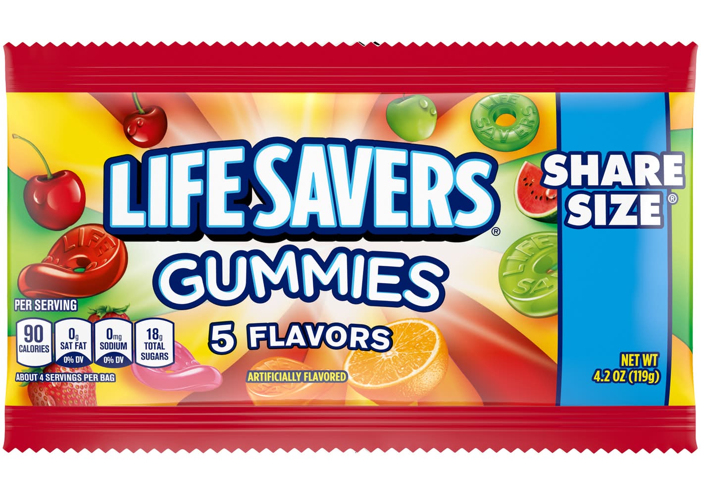 Who could resist the simple joy of the soft, chewy, fruity goodness of Life Savers Gummies? Who would want to? The classic combination of cherry, watermelon, green apple, strawberry, and orange flavors in Life Savers 5 Flavors Gummies recalls the treats we enjoyed growing up. So give yourself a moment to feel like a kid again with Life Savers Gummies candy: The candy that's more fun for your mouth. • Brand: Life savers • Flavor: Cherry, watermelon, orange, strawberry, green apple