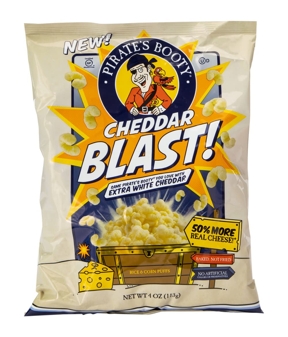 savor even more cheesy cheddary goodness with pirate's booty® cheddar blast! extra white cheddar rice & corn puffs!a satisfyingly crunchy snack you'll love to munch on.size: 4ozbaked not fried. made with real cheese!no artificial colors or preservativesgluten-freeCountry of Origin: usa