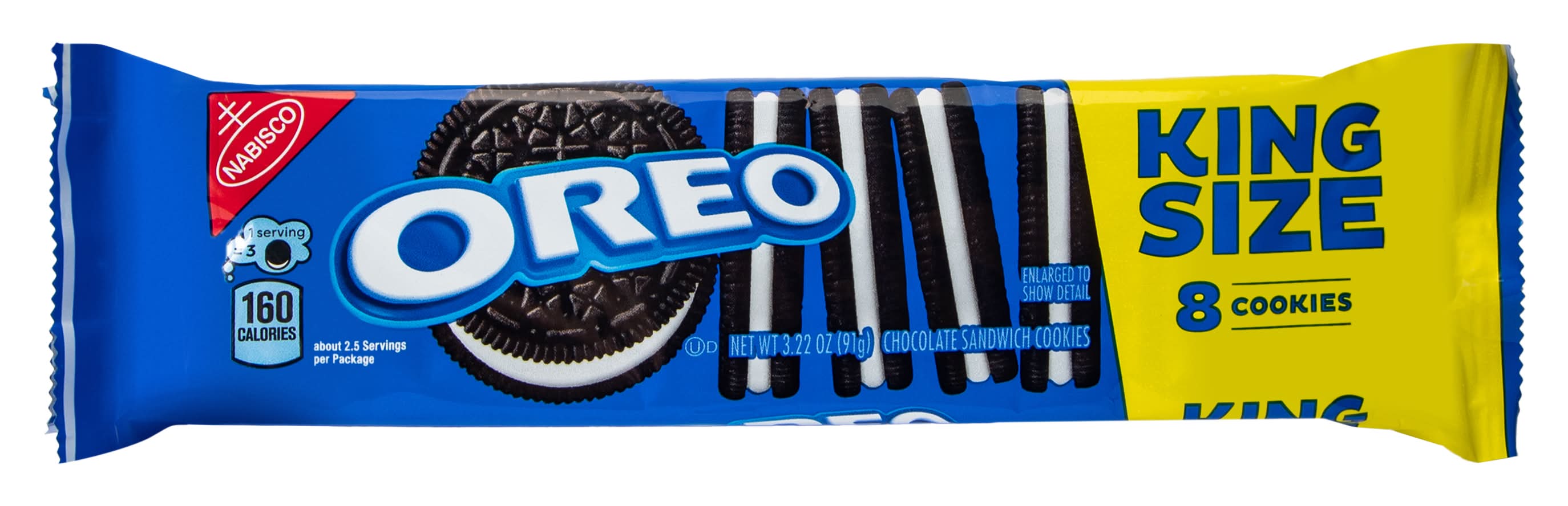 Go big or go home with Oreo King Size Cookies 3.2oz! Double the fun, double the deliciousness.Includes 8 cookies.Size: 3.2ozCountry of Origin: USA