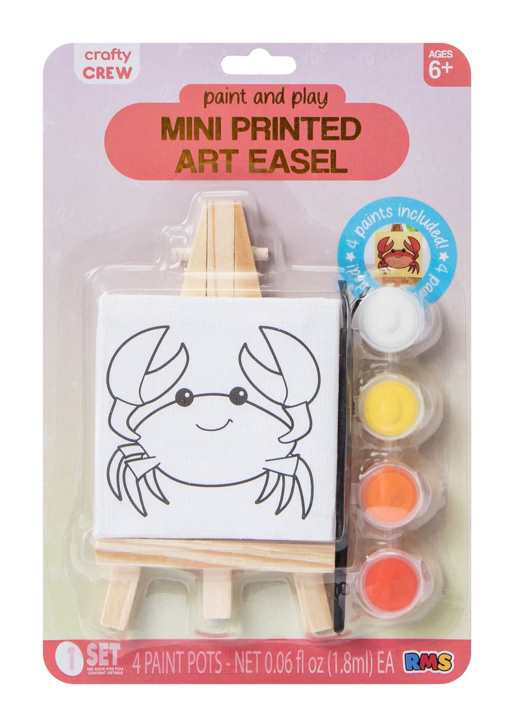 Unleash your mini masterpiece maker's creativity with this super-fun Paint And Play Mini Printed Art Easel Set.With 4 paint pots 0.06oz each.Ages: 6+Country of Origin: Imported Color: Crab