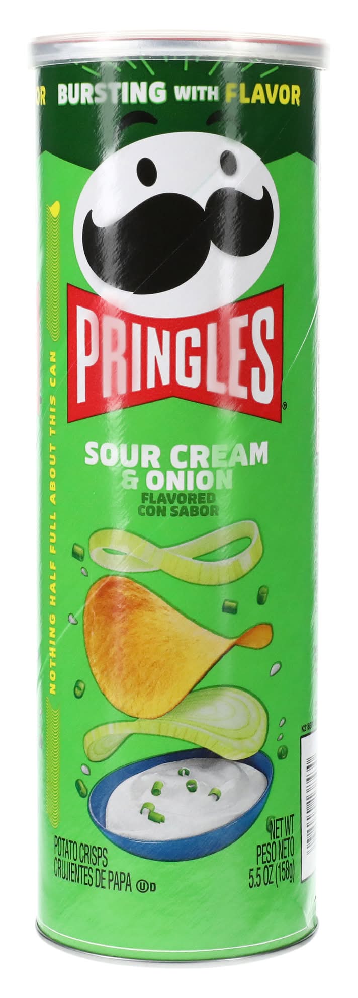 enjoy the classic taste of pringles sour cream & onion potato crisps. these delish chips will always have a place in our hearts!!stack up the flavor!!size: 5.5ozCountry of Origin: usa • Color: Sour cream & onion • Packaging: Reusable