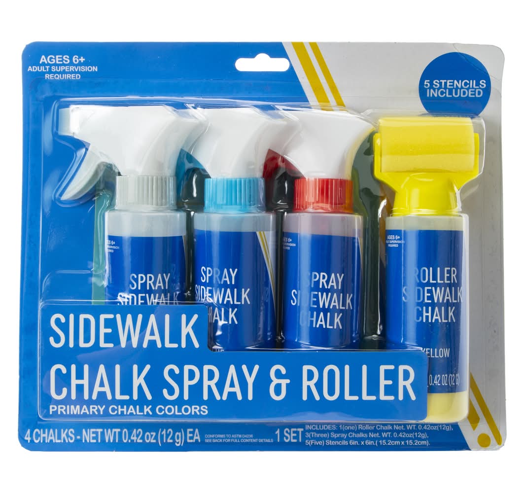 Have hours of mess-free fun with a sidewalk chalk spray & roller set. Decorate your driveway pavement for parties, outdoor fun & more!Features convenient spray bottles so your hands can stay squeaky clean.Includes 1 roller chalk (0.42oz), 3 spray chalks (0.42oz) & 5 stencils (6in x 6in)Ages: 6+ (Adult Supervision Required)Country of Origin: Imported Color: Primary