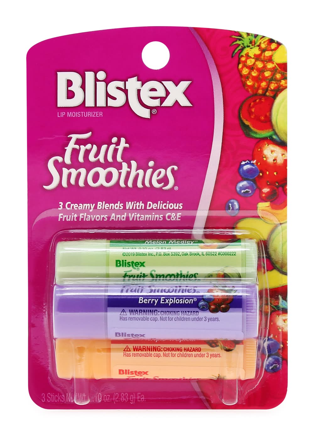 the blistex® fruit smoothies® multipack has 3 creamy blends of soothing spf 15 lip balm in delish fruit flavors. stock up!spf 15 lip balm keeps lips soft, smooth & protectedlip protectant/sunscreenincludes 3 x blistex® fruit smoothies® lip balmCountry of Origin: usa Packaging: Reusable