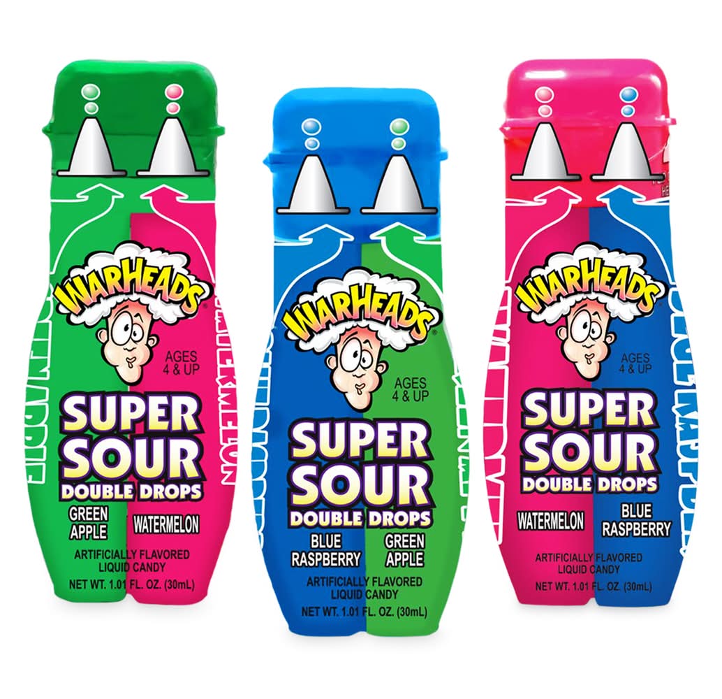 can you handle warheads® super sour double drops?! each one has two flavors - try one, the other, or both at the same time!flavors: green apple & watermelon, blue raspberry & green apple, or watermelon & blue raspberrysize: 1.01ozCountry of Origin: usaAll candy is non-returnable