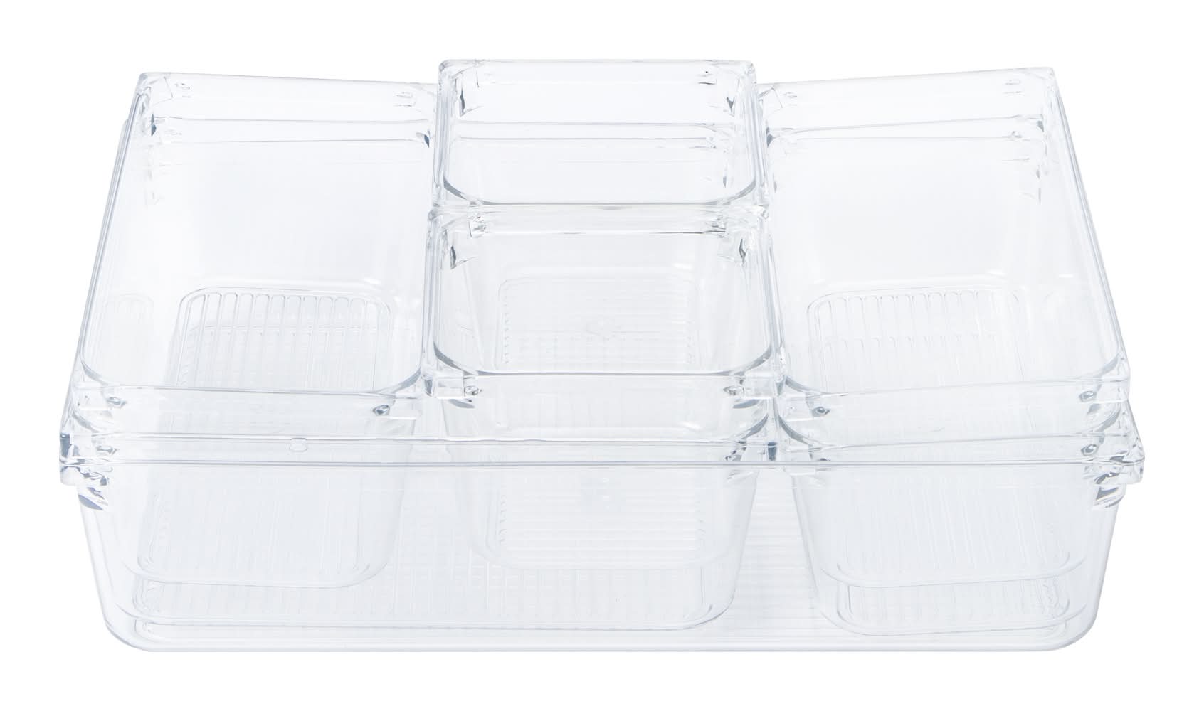 Keep your space tidy and fresh with this 7-piece drawer organizer.Perfect for stashing all your daily essentials.Includes 2 square tray, 3 rectangle tray, 1 square tray, 1 rectangle tray.Country of Origin: Imported Color: Clear