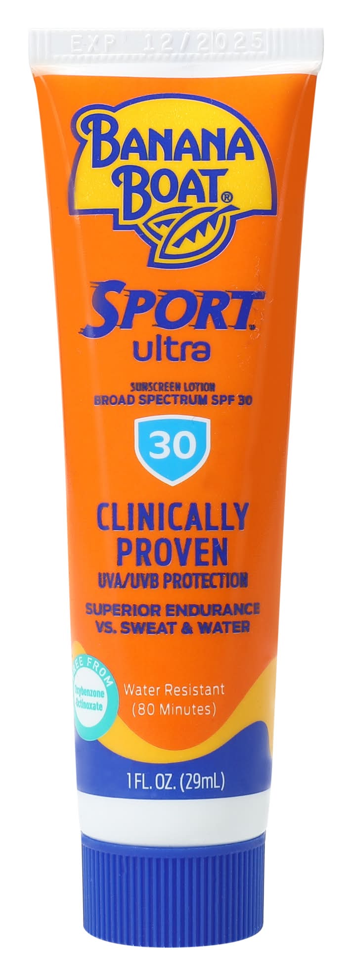 protect your skin with banana boat sport ultra sunscreen! it's especially ideal for days at the pool or beach, or anytime you're in the splash zone.provides superior endurance vs. sweat & waterclinically proven UVA protectionfree from oxybenzonespf 30travel size: 1ozCountry of Origin: imported Color: Sport spf 30 lotion