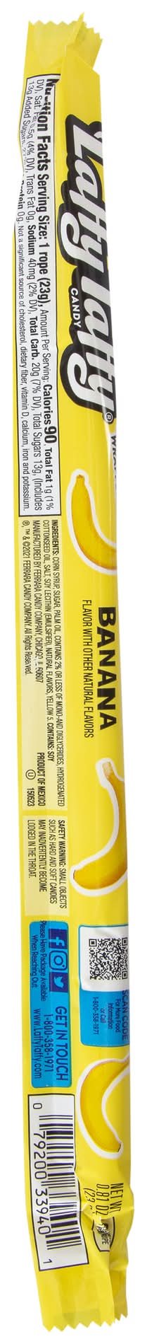 lasso up some serious flavor with this laffy taffy rope candy! a soft & chewy candy that’s tied up in tastiness.includes 1 piece of candy features jokes on every wrapperflavor: bananasize: 0.81ozCountry of Origin: usaAll candy is non-returnable Color: Banana