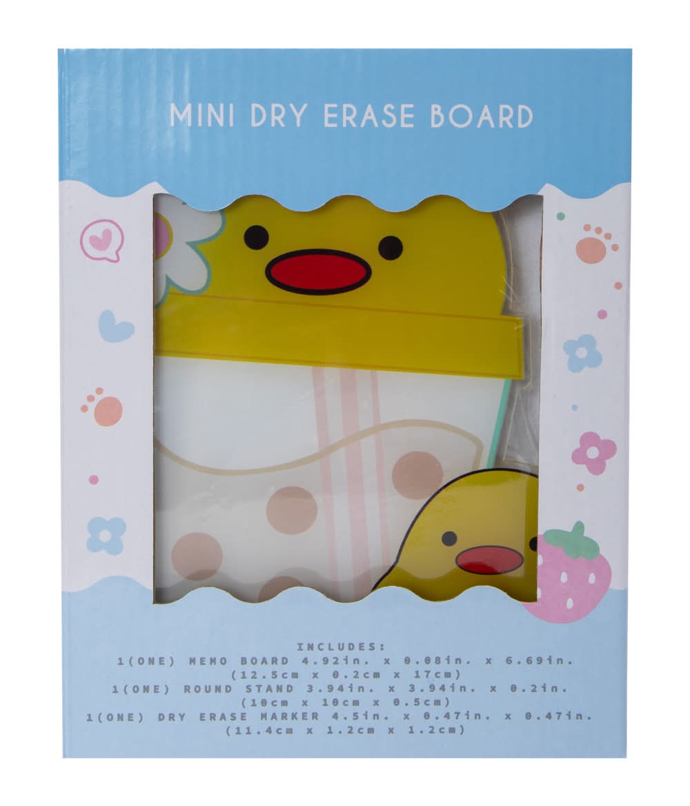 Hang a Mini Kawaii Dry Erase Board to keep your reminders & notes in 1 place. Stay organized this school year!Includes 1 memo board, 1 dry erase marker,1 round standSize: 4.92in (W) x 6.69in (L)Country of Origin: Imported Color: Duck